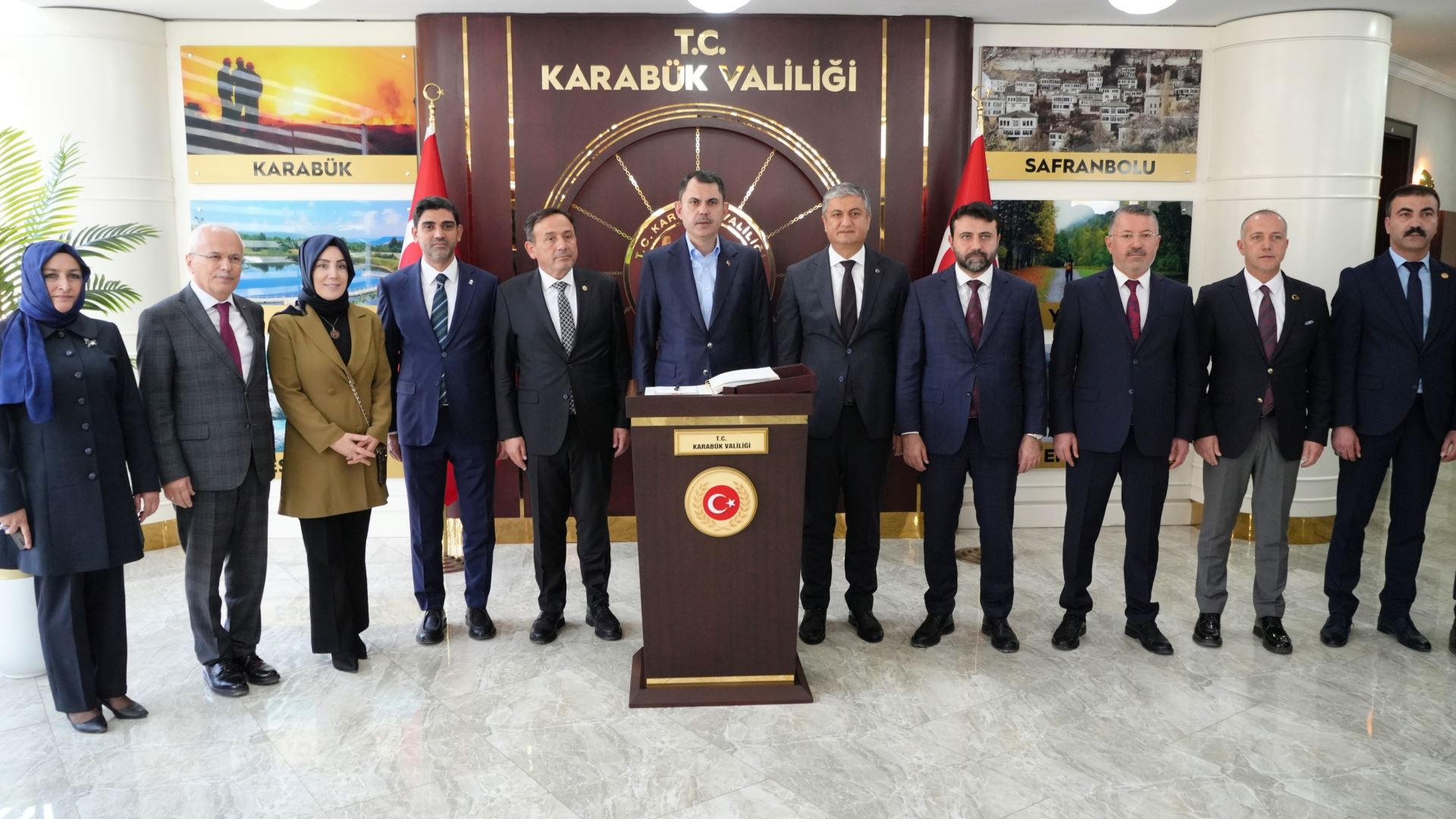 Valilik önünde Vali Mustafa Yavuz, Karabük Milletvekilleri Cem Şahin ve Ali Keskinkılıç, Karabük Belediye Başkanı Özkan Çetinkaya, Karabük Üniversitesi Rektörü Prof. Dr. Fatih Kırışık, siyasi parti temsilcileri ve kurum müdürleri tarafından karşılanan Bakan Kurum, Valilik Şeref Defteri’ni imzaladıktan sonra Valilik makamında bir toplantı gerçekleştirdi.