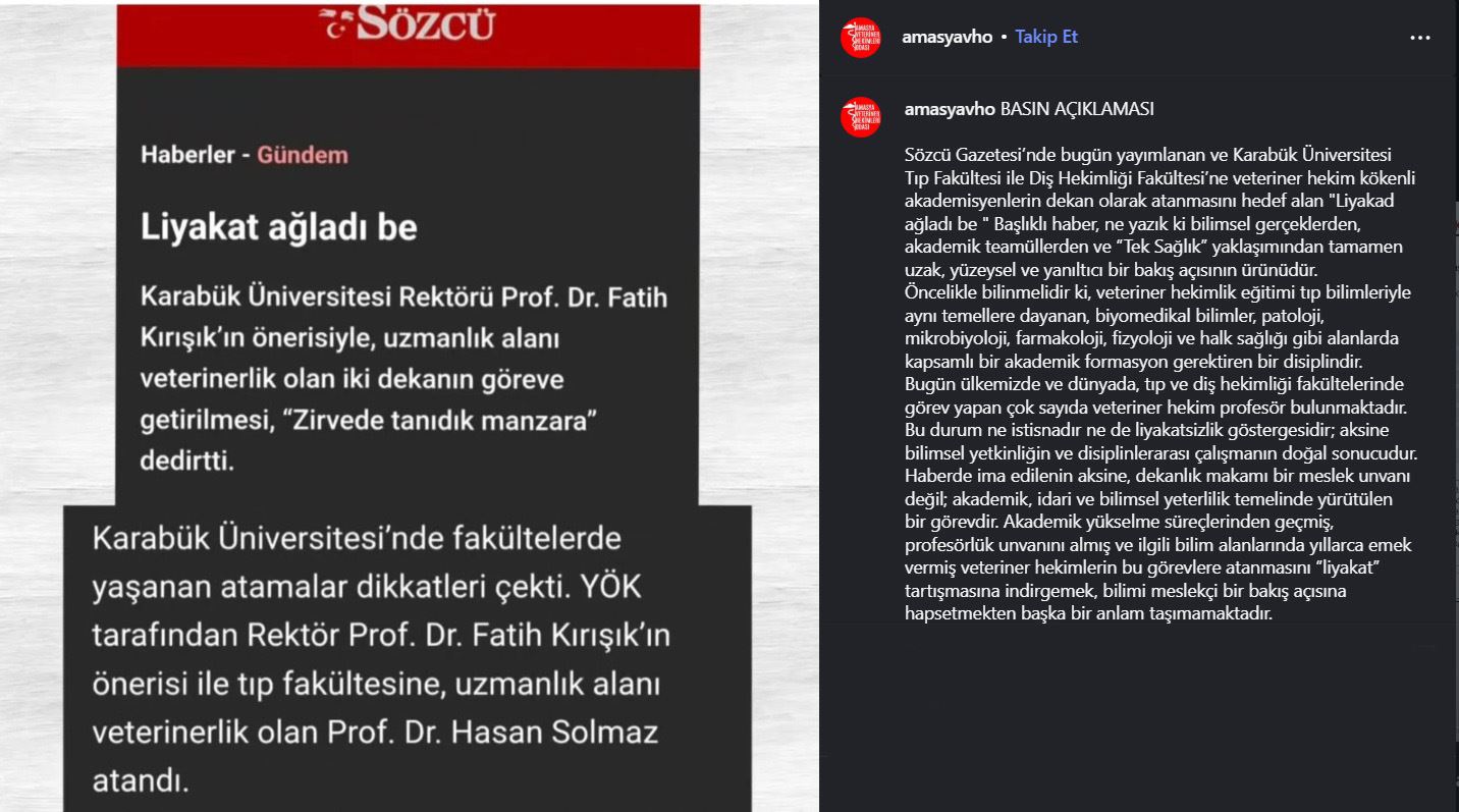 Sözcü Gazetesi’nde bugün yayımlanan ve Karabük Üniversitesi Tıp Fakültesi ile Diş Hekimliği Fakültesi’ne veteriner hekim kökenli akademisyenlerin dekan olarak atanmasını hedef alan "Liyakad ağladı be " Başlıklı haber, ne yazık ki bilimsel gerçeklerden, akademik teamüllerden ve “Tek Sağlık” yaklaşımından tamamen uzak, yüzeysel ve yanıltıcı bir bakış açısının ürünüdür.