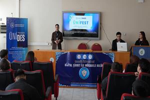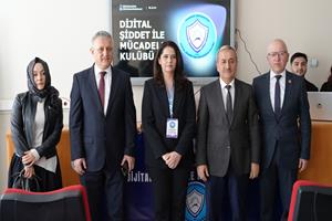 Programın devamında Dijital Şiddetle Mücadele Kulübü akademik danışmanı Dr. Öğr. Üyesi Hülya Özçağlar Eroğlu ve Proje Koordinatörü Cansel Arı, “Dijital Şiddetle Mücadele” başlıklı sunum gerçekleştirdi. Sunumda dijital şiddetin sadece hakaret ve küfürden ibaret olmadığı, özel hayatın ihlali, kimlik hırsızlığı ve çevrim içi dolandırıcılık gibi farklı boyutları bulunduğu ifade edildi.
