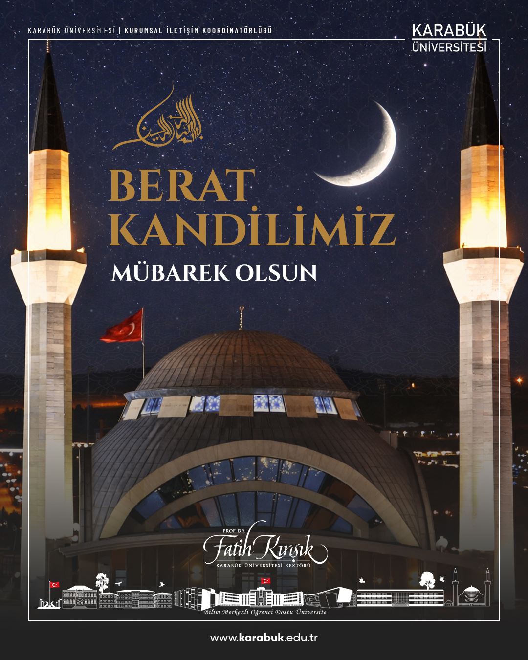 Karabük Üniversitesi Rektörü Prof. Dr. Fatih Kırışık, Berat Kandili mesajında; bu mübarek gecenin iman ve ibadet bilincini güçlendirmesini, kardeşlik, merhamet ve dayanışma duygularını pekiştirmesini temenni ederek aziz milletimizin ve tüm İslam âleminin kandilini tebrik etti.