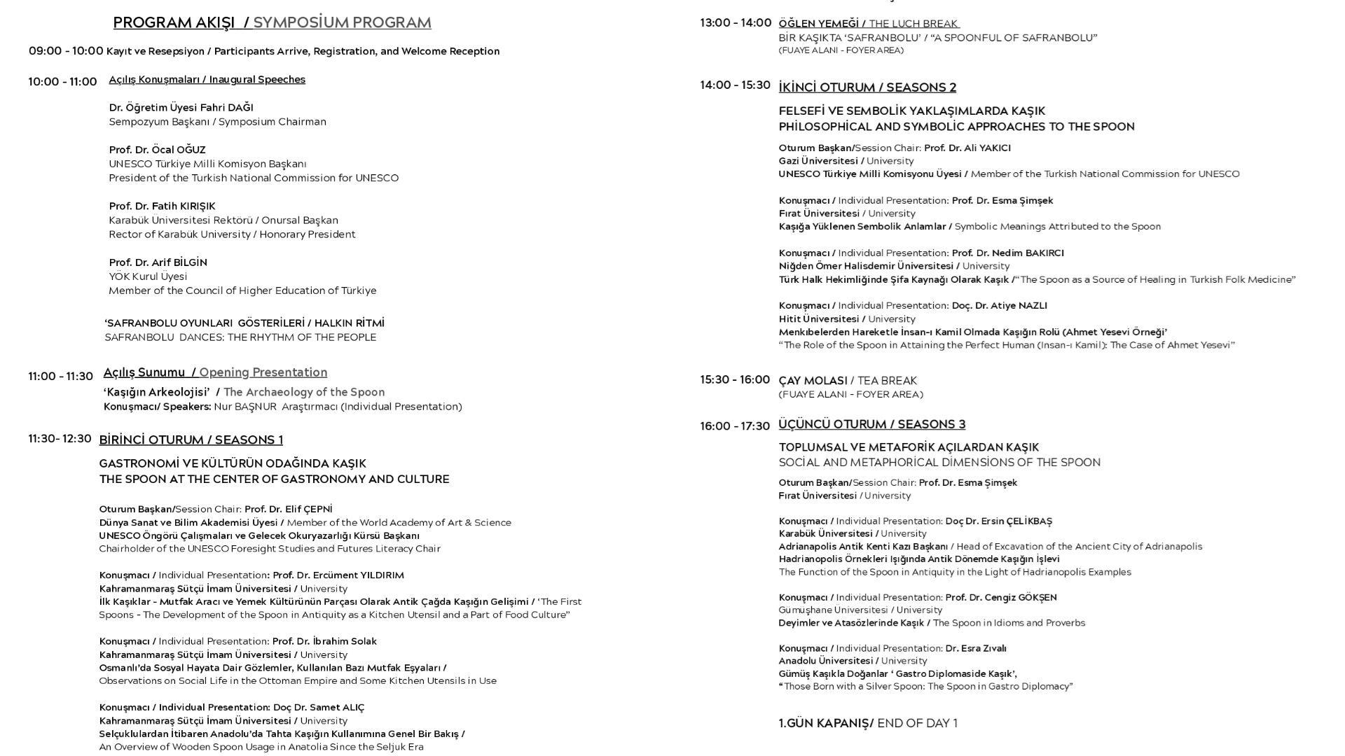 Etkinliğin ilk günü, “Gastronomi ve Kültürün Odağında Kaşık”, “Felsefî ve Sembolik Yaklaşımlarda Kaşık” ve “Toplumsal ve Metaforik Açılardan Kaşık” başlıklı oturumlarla devam edecek. İkinci gün ise “Sanat, Edebiyat ve Mizahta Kaşık” temalı oturumların yanı sıra şef sunumları, sanat performansları ve sergilerle renklenecek.