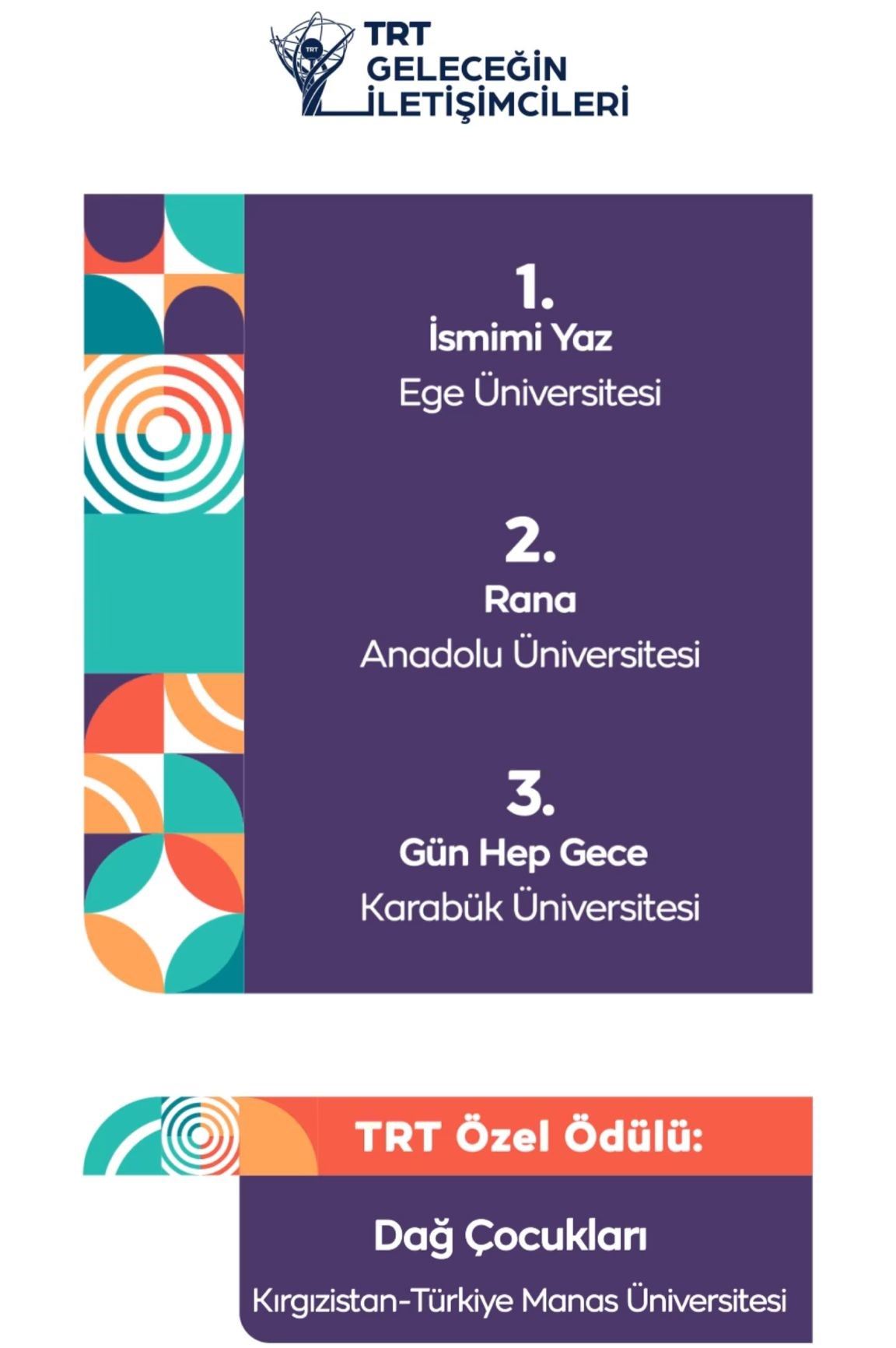 Karabük Üniversitesi (KBÜ) Safranbolu Türker İnanoğlu İletişim Fakültesi Radyo, Televizyon ve Sinema Bölümü öğrencileri, TRT tarafından bu yıl 11’incisi düzenlenen “Geleceğin İletişimcileri Yarışması”nda “Gün Hep Gece” adlı belgeselleriyle üçüncülük ödülü kazandı.