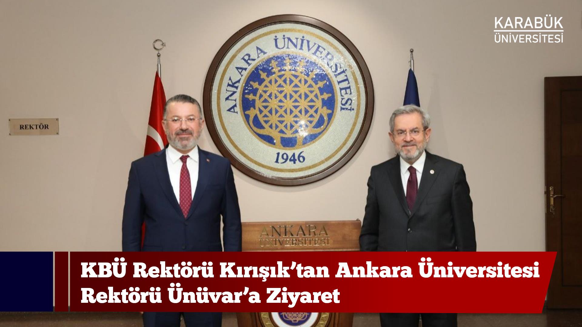 Karabük Üniversitesi (KBÜ) Rektörü Prof. Dr. Fatih Kırışık, Ankara Üniversitesi Rektörü Prof. Dr. Necdet Ünüvar ile bir araya geldi. Ankara Üniversitesi rektörlük makamında gerçekleşen görüşmede, iki üniversite arasında yürütülebilecek akademik ve bilimsel iş birlikleri ile toplumsal katkı odaklı çalışmalar ele alındı.