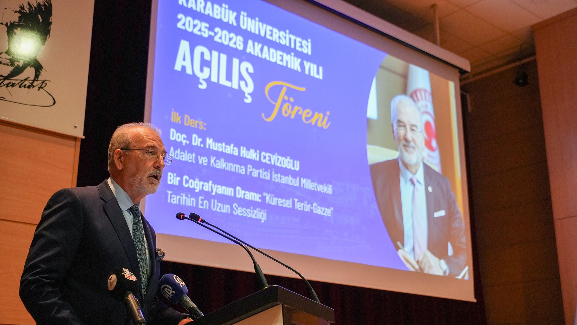 Karabük Üniversitesi 2025–2026 Akademik Yılı, Doç. Dr. Mustafa Hulki Cevizoğlu’nun “Küresel Devlet Terörü – Gazze” konulu ilk dersiyle başladı. Törende konuşan Rektör Prof. Dr. Fatih Kırışık, Filistin’in insanlığın onurunu temsil ettiğini belirterek bilimde ilerlemenin önemini vurguladı.