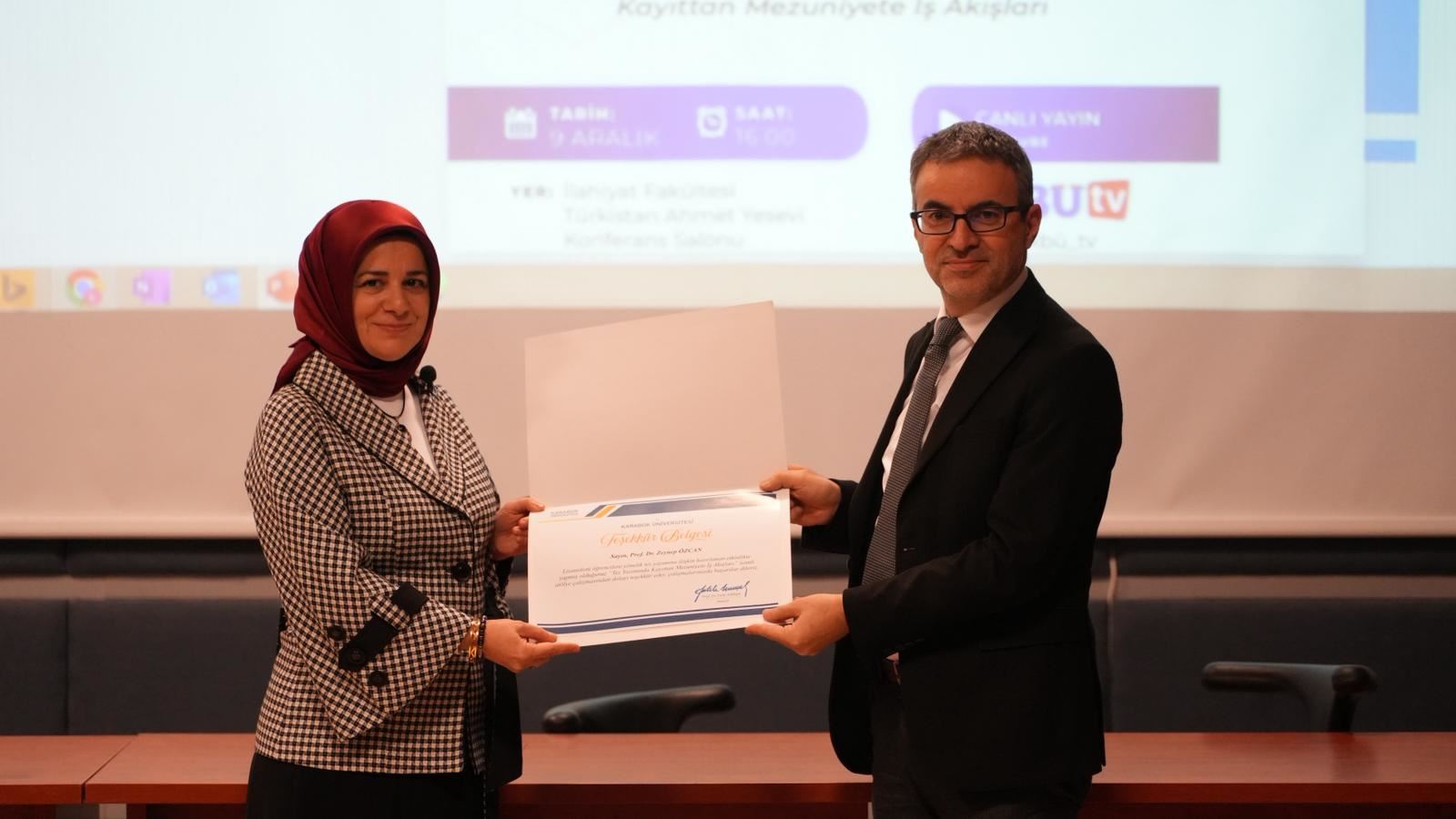 Prof. Dr. Zeynep Özcan’ın sunumunun ardından İktisadi ve İdari Bilimler Fakültesi Dekanı Prof. Dr. Ersin Müezzinoğlu, katkılarından dolayı Özcan’a teşekkür belgesi takdim etti.