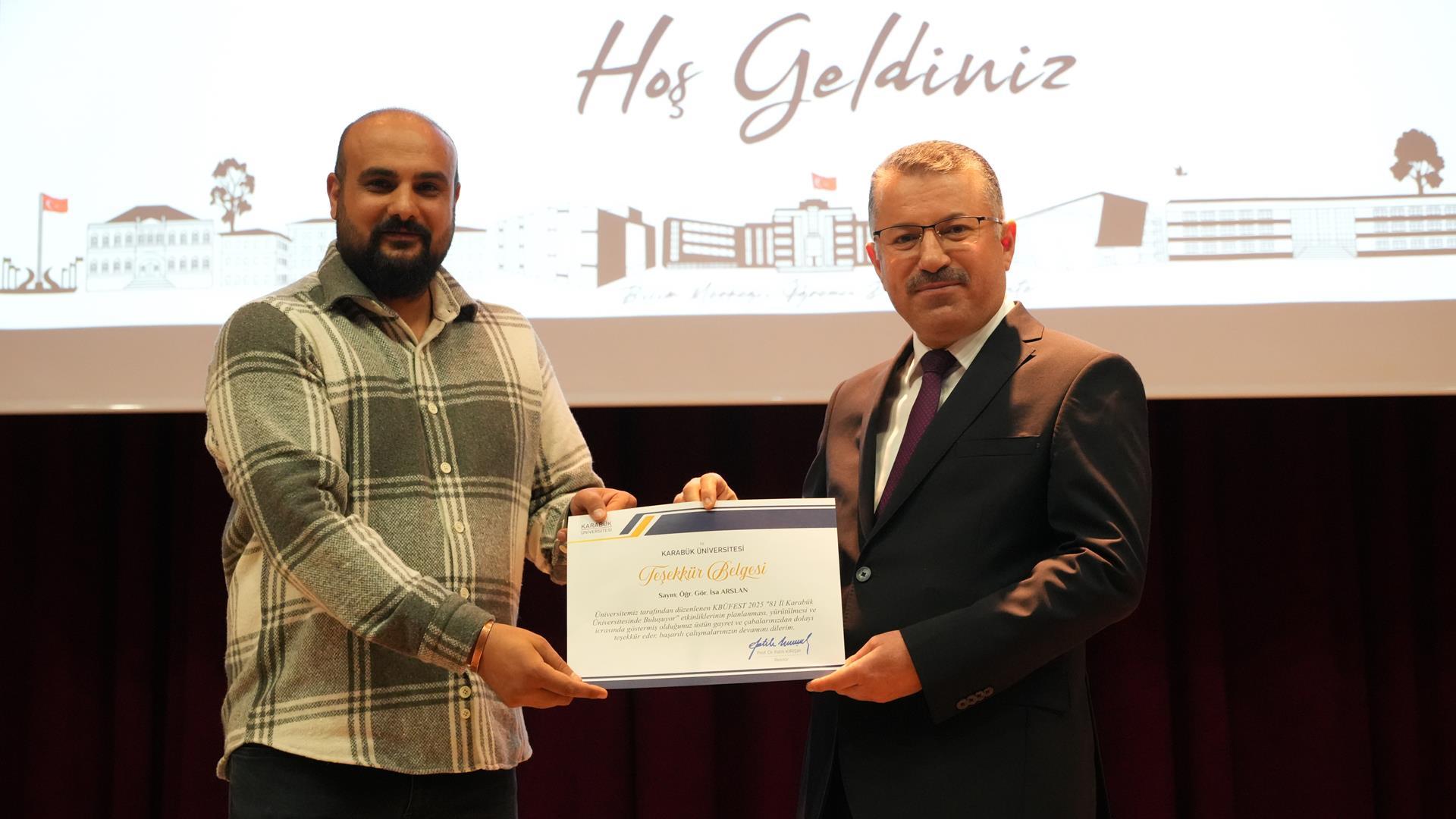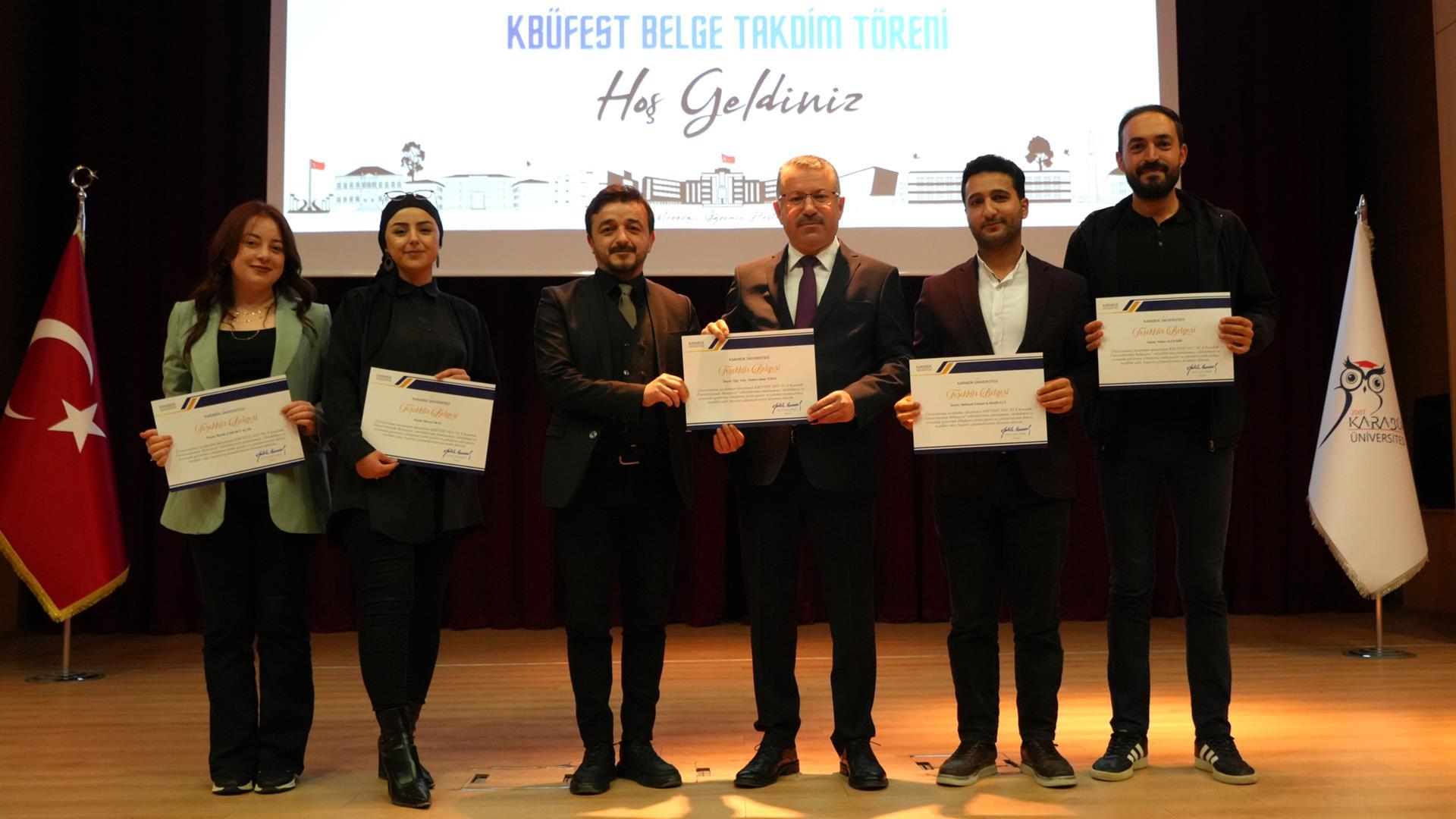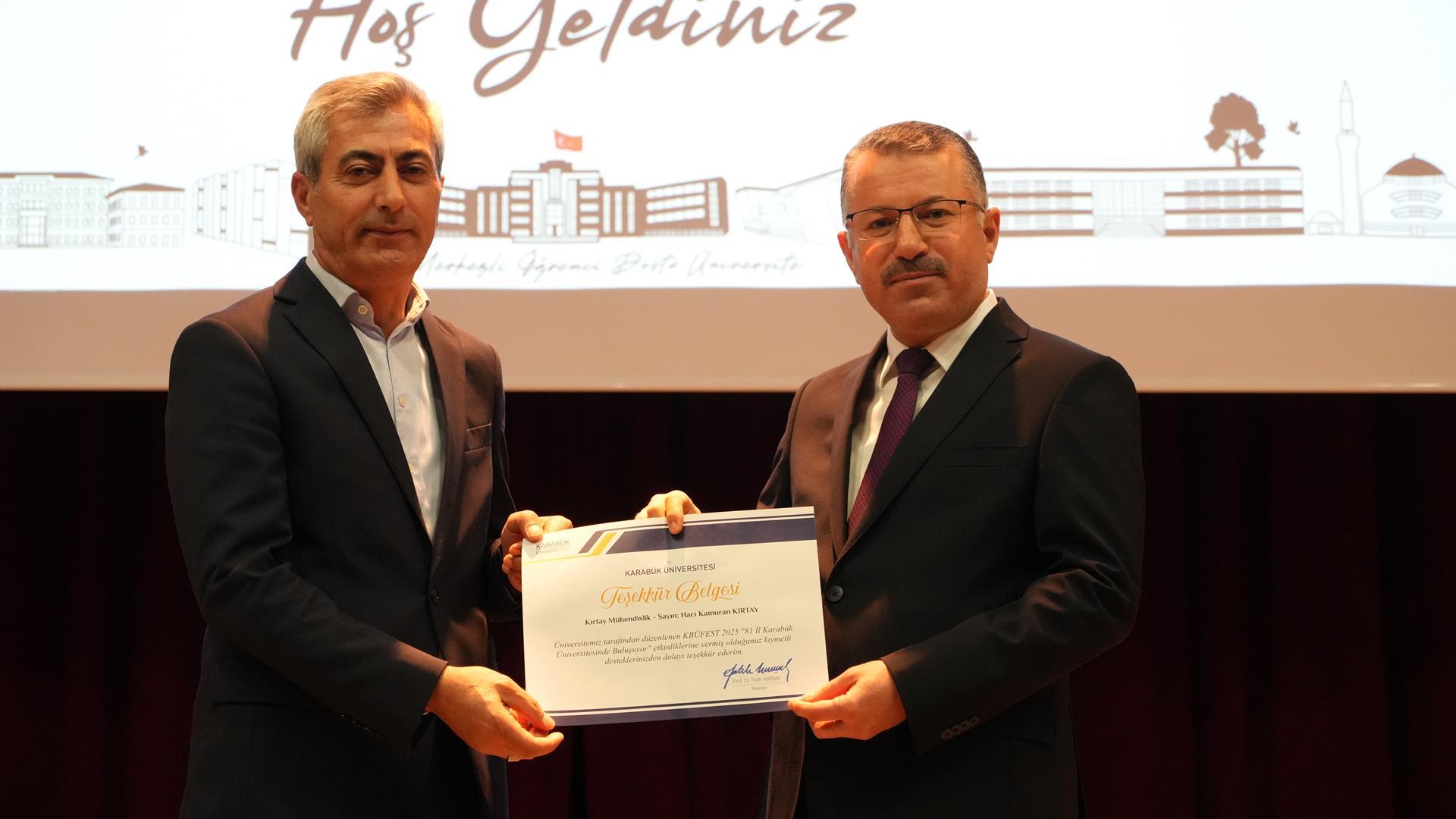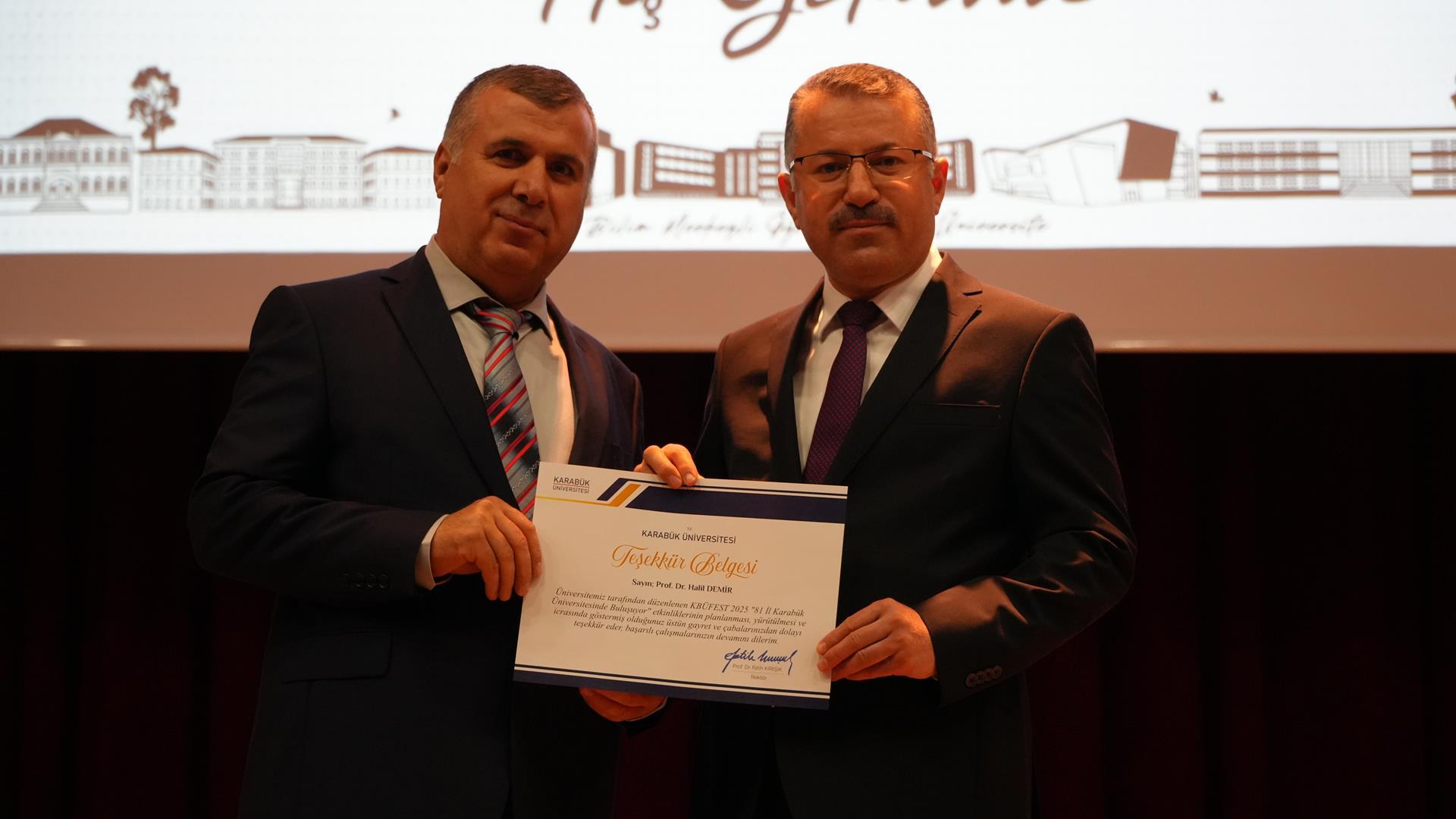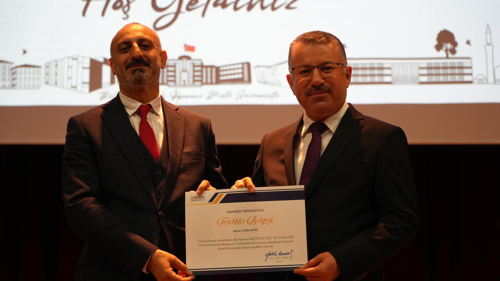 Karabük Üniversitesinin (KBÜ) kültürel marka etkinliği KBÜFEST 2025’in ardından, festivale katkı sunanlara Rektör Prof. Dr. Fatih Kırışık tarafından teşekkür belegesi takdim edildi.