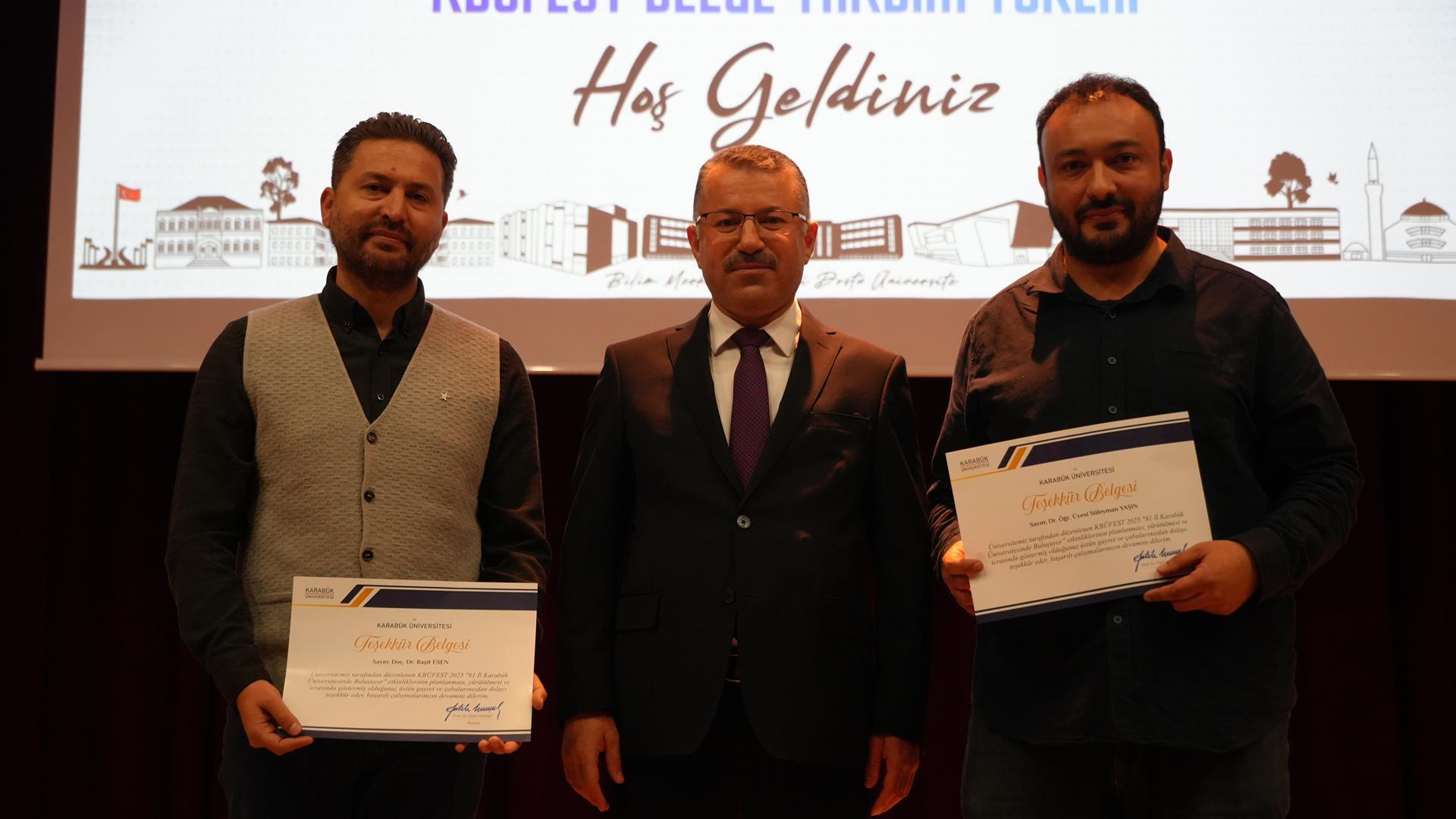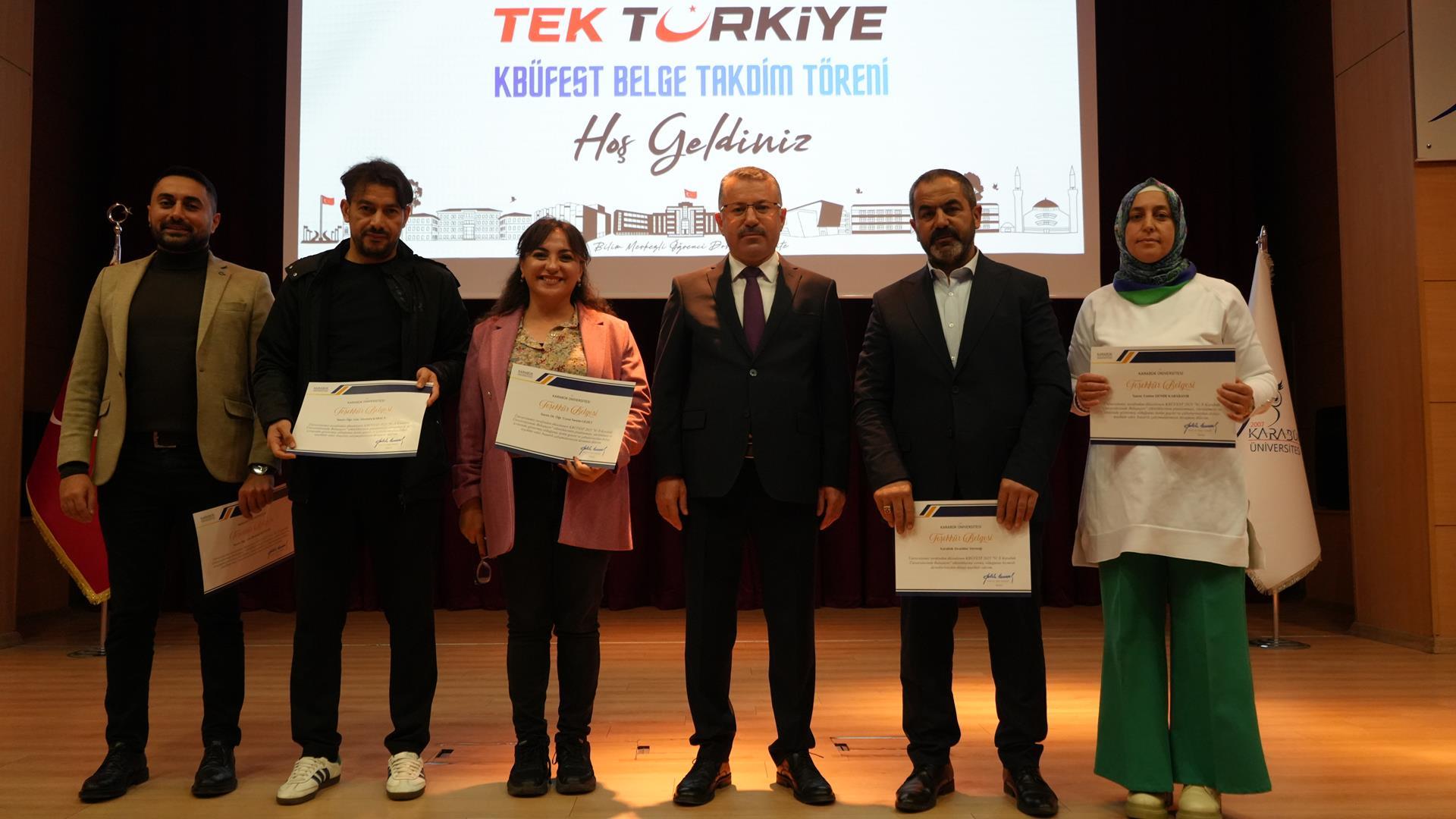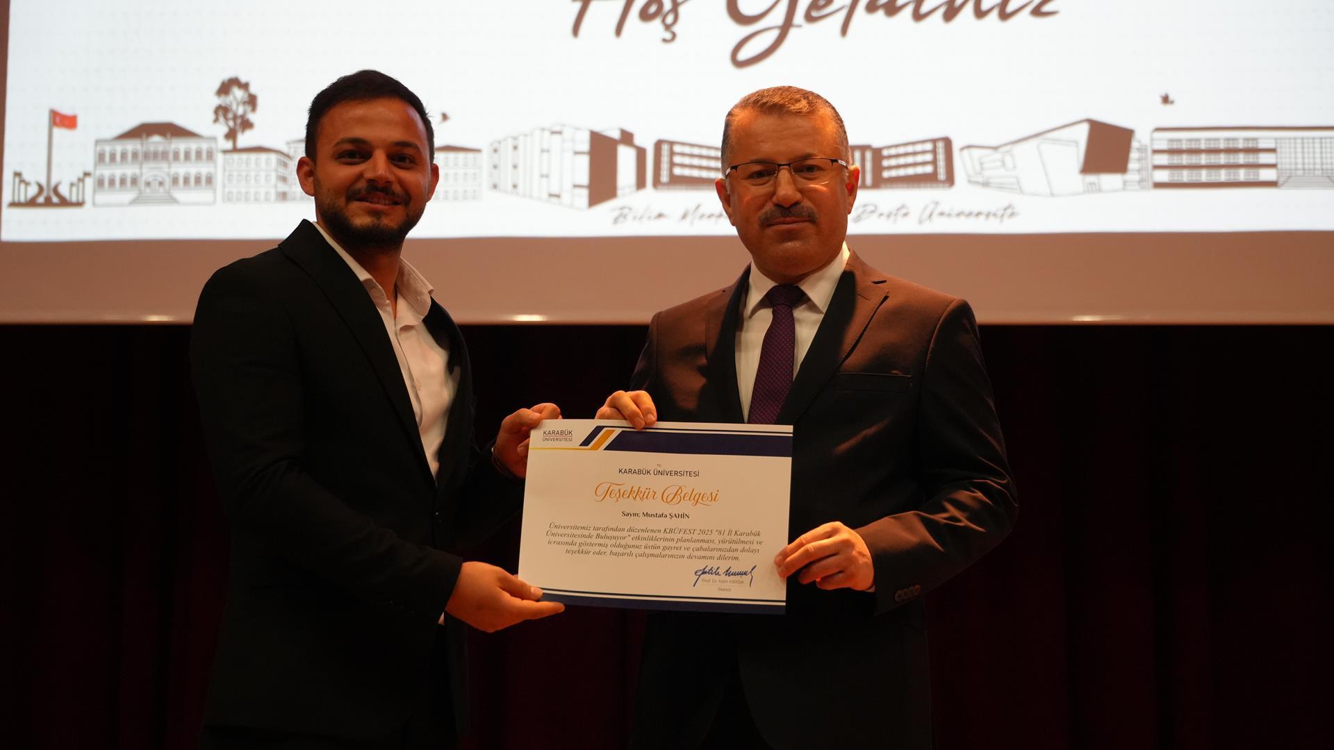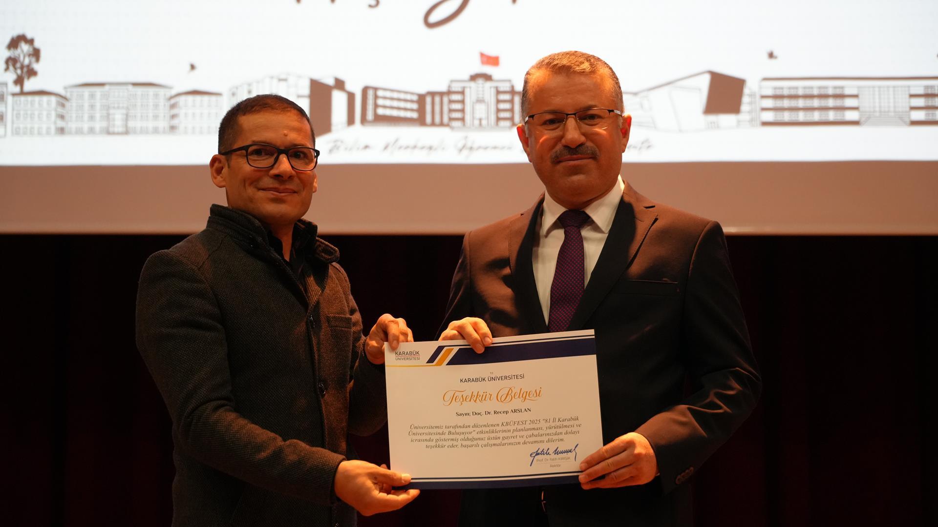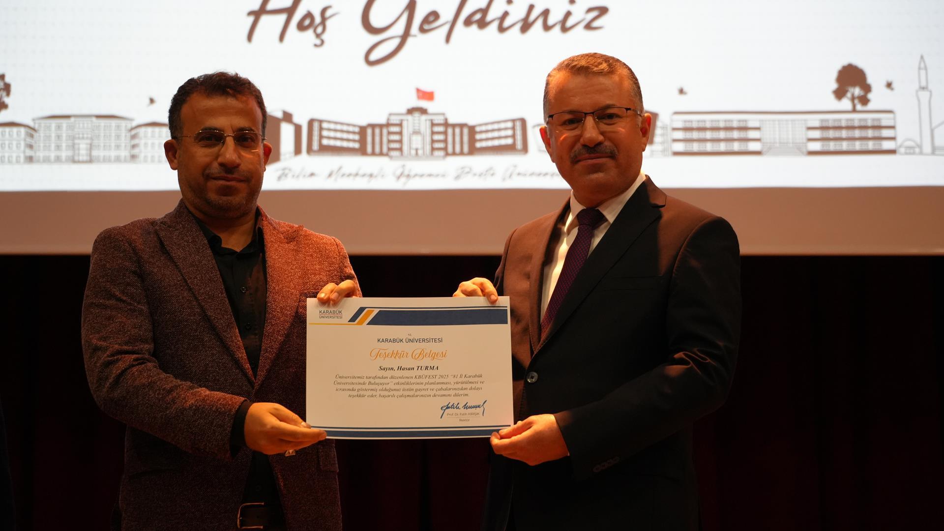Karabük Üniversitesinin (KBÜ) kültürel marka etkinliği KBÜFEST 2025’in ardından, festivale katkı sunanlara Rektör Prof. Dr. Fatih Kırışık tarafından teşekkür belegesi takdim edildi.