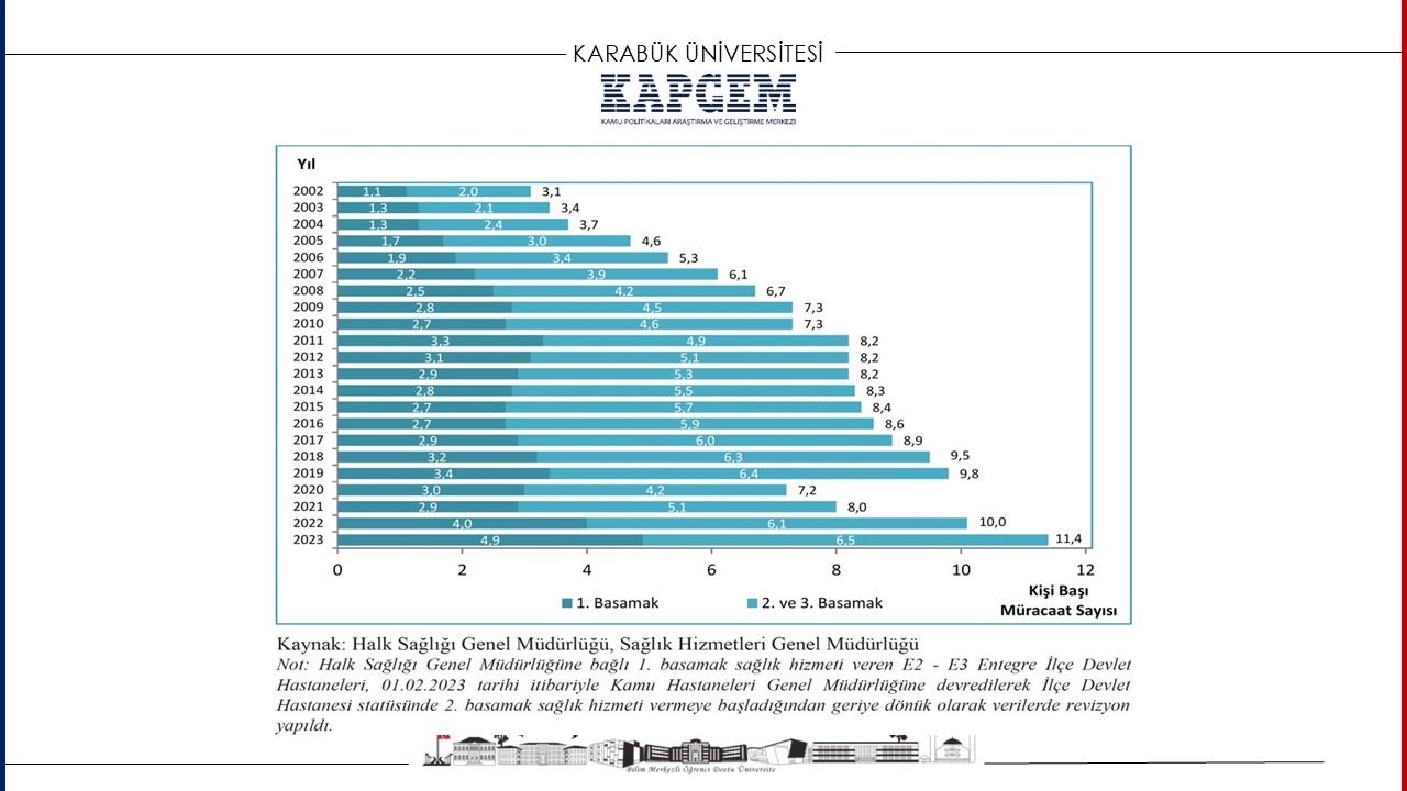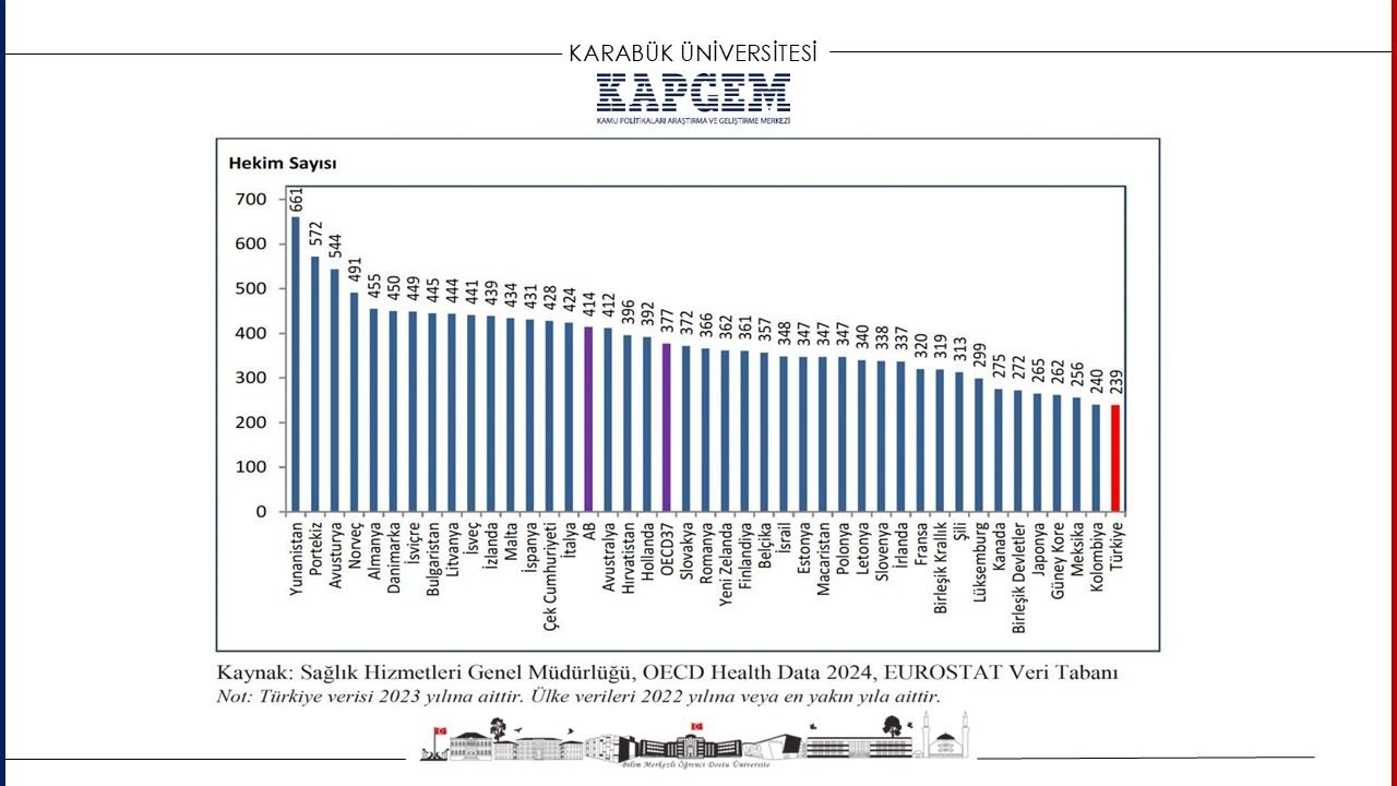 Sunumda yer verilen verilere göre, 2002 yılında 3.1 olan kişi başı hekime başvuru sayısı, 2023 yılında 11.4’e yükseldi. Uzman hekim sayısı artmasına rağmen, Türkiye 100.000 kişiye düşen hekim sayısında uluslararası karşılaştırmalarda alt sıralarda yer alıyor.