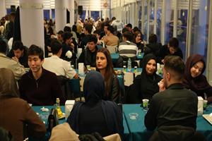 Serginin ardından iftar saatini bekleyen öğrencilerle sohbet eden Destici ve Rektör Kırışık, daha sonra akademisyenler, öğrenciler ve davetlilerin katılımıyla gerçekleştirilen iftar programında bir araya geldi.