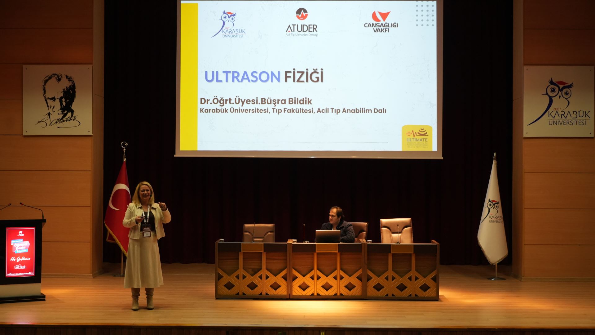 Açılış konuşmalarının ardından Dr. Öğr. Üyesi Büşra Bildik tarafından “Ultrason Fiziği ve Knoboloji”, Doç. Dr. Bora Çekmen tarafından ise “Temel Kardiyak Ultrasonografi (FoCUS)” başlıklı sunumlar gerçekleştirildi.