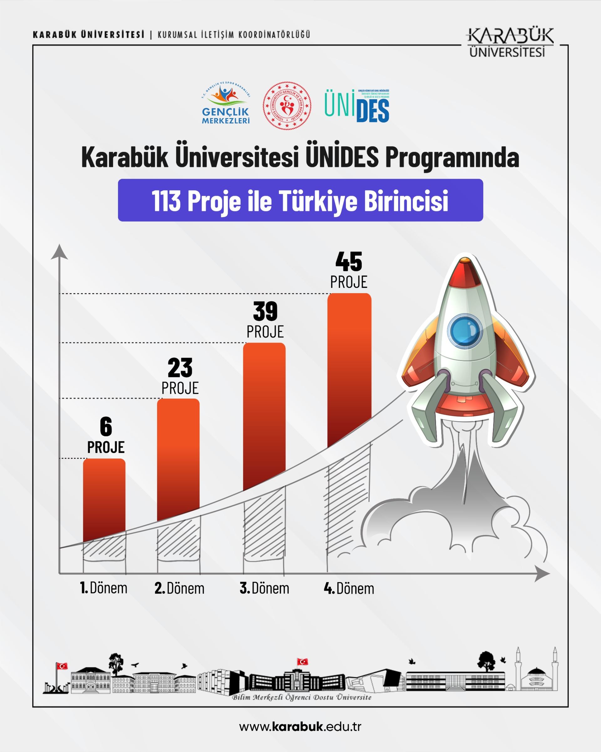 Karabük Üniversitesi, Gençlik ve Spor Bakanlığı Gençlik Hizmetleri Genel Müdürlüğü tarafından yürütülen Üniversite Öğrenci Toplulukları İş Birliği ve Destek Programı (ÜNİDES) kapsamında ulaştığı başarıyla dikkat çekiyor. 2024-2025 eğitim öğretim yılı boyunca dört dönem hâlinde yürütülen programın sonunda Karabük Üniversitesi, toplamda destek almaya hak kazanan 113 projesiyle Türkiye birincisi oldu.