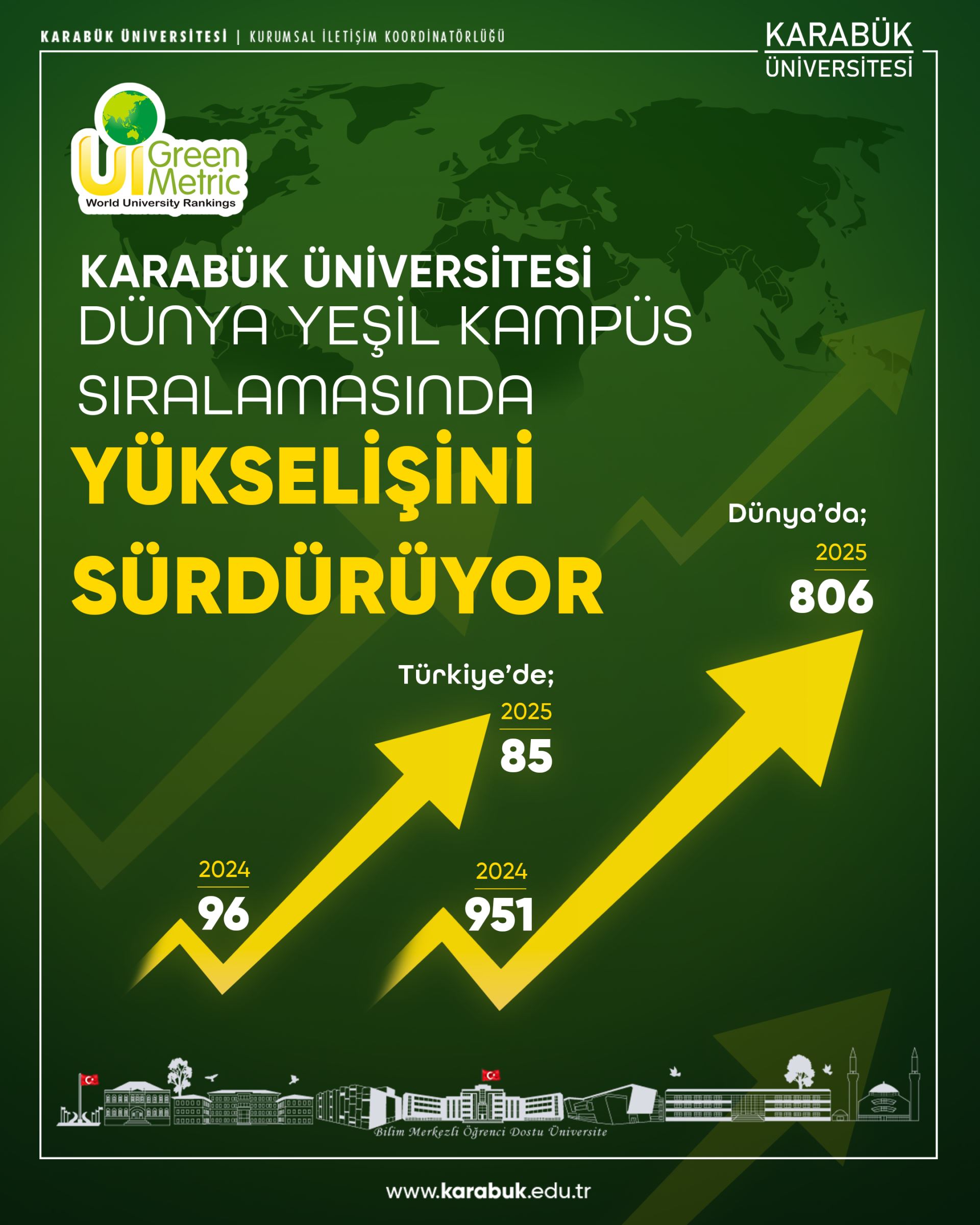 Karabük Üniversitesi (KBÜ) temiz enerji, yeşil ulaşım ve sürdürülebilir eğitim alanlarında yürüttüğü çalışmalarla UI GreenMetric Dünya Üniversiteler Sıralaması 2025 sonuçlarında dikkat çekici bir başarı elde etti. Üniversite, geçen yıla göre dünya sıralamasında 951’den 806’ya yükselerek 145 basamak, Türkiye sıralamasında ise 96’dan 85’e çıkarak 11 basamak ilerleme kaydetti.