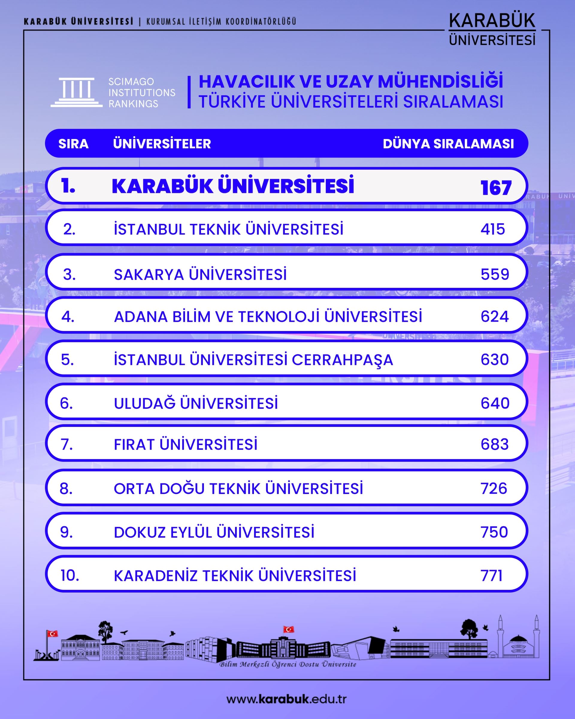 Havacılık ve Uzay Mühendisliği alanında Türkiye’de 1. sırada yer alan Karabük Üniversitesi, Orta Doğu ülkeleri arasında 4’üncü, OECD ülkeleri arasında 57’nci ve dünya üniversiteleri arasında 167’nci sırada yer aldı.