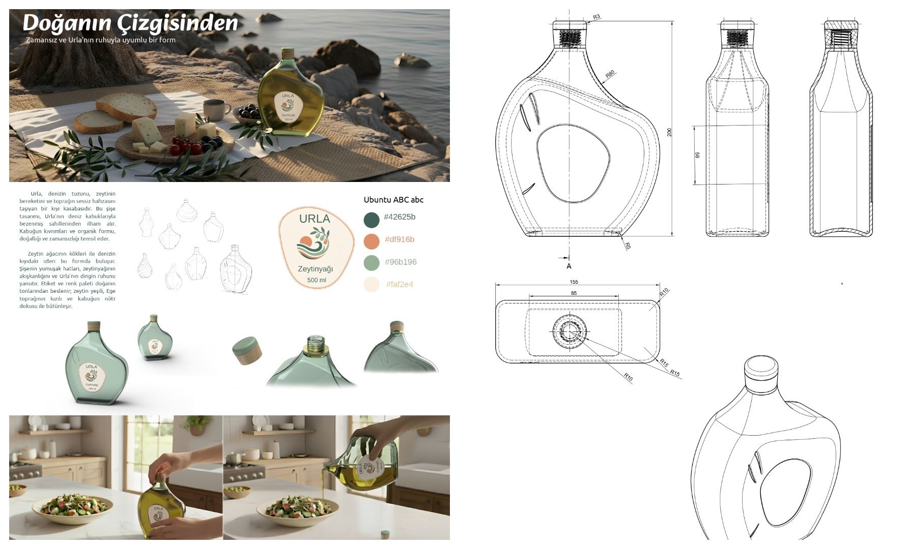 Safranbolu Fethi Toker Güzel Sanatlar ve Tasarım Fakültesi Endüstriyel Tasarım Bölümü öğrencisi Feyza Sinem Taş’ın yarışmada finale kalan çalışması, Urla’nın deniz kabuklarıyla bezeli kıyılarından ve zeytin ağacının köklü kültüründen ilham alıyor. Organik formu ve doğal renk tercihleriyle zeytinyağının akışkanlığını ve bölgenin dingin atmosferini yansıtan tasarım, etiket bölümünde zeytin yeşili, Ege toprağının kızılı ve nötr kabuk tonlarıyla bütünleşiyor.