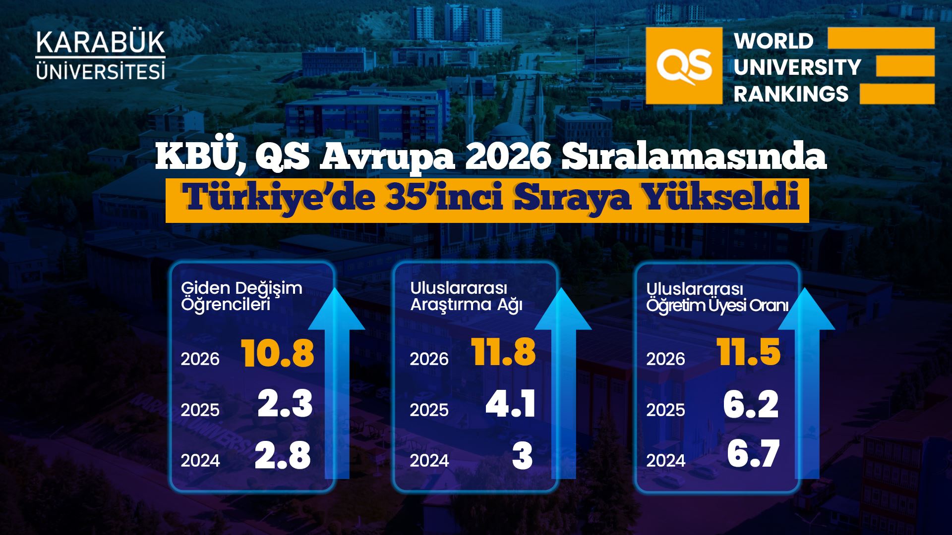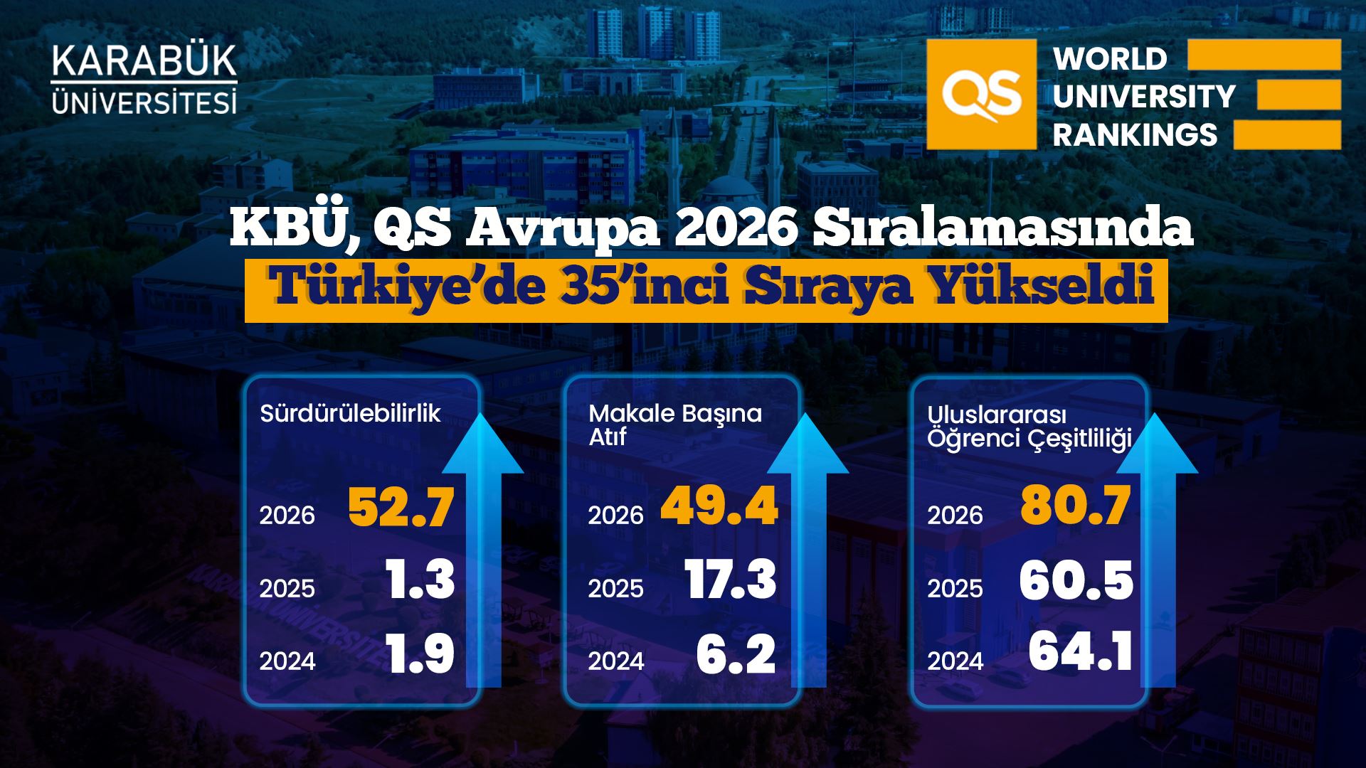 Uluslararası yükseköğretim derecelendirme kuruluşu QS (Quacquarelli Symonds) tarafından açıklanan QS Avrupa Üniversiteleri 2026 sonuçlarına göre Karabük Üniversitesi (KBÜ), Avrupa üniversiteleri arasında 571–580 bandında yer alarak konumunu güçlendirdi. Üniversite, Türkiye sıralamasında ise 2025’te 38’inci sıradayken 2026’da 35’inci sıraya yükseldi.