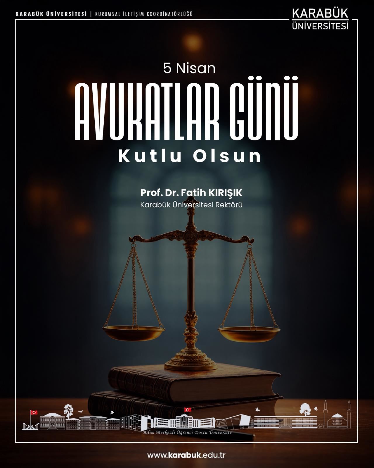 Karabük Üniversitesi (KBÜ) Rektörü Prof. Dr. Fatih Kırışık, 5 Nisan Avukatlar Günü dolayısıyla yayımladığı mesajda, avukatlık mesleğinin adaletin sağlanması ve toplumsal güvenin tesisindeki rolüne vurgu yaparak şu değerlendirmelerde bulundu: