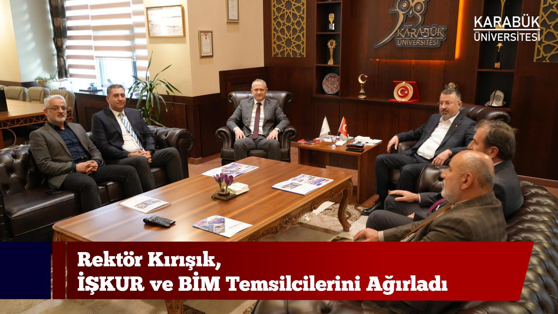 KBÜ Rektörü Prof. Dr. Fatih Kırışık, İŞKUR İl Müdürü Sinan Karademir ile BİM Mali ve İdari İşler Sorumlusu Ayhan Sarıyı makamında kabul etti. Rektörlük makamında yapılan görüşmede Rektör Yardımcısı Prof. Dr. Hasan Solmaz, Genel Sekreter Lütfü Köm ve Strateji Geliştirme Daire Başkanı Kemal Özeken de hazır bulundu.