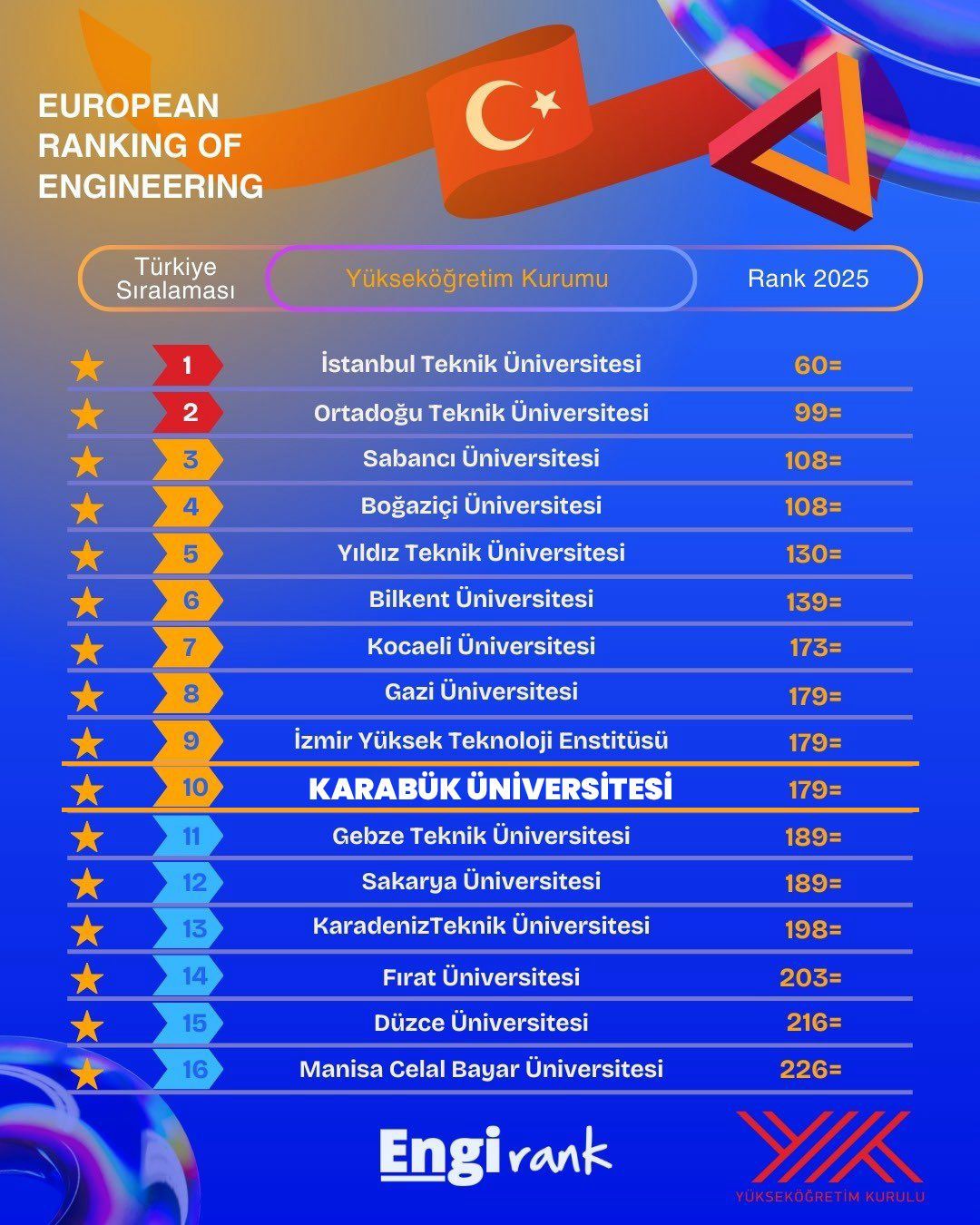 Avrupa’nın önde gelen mühendislik sıralama kuruluşu European Ranking of Engineering Programmes (EngiRank) tarafından açıklanan 2025 sonuçlarında Karabük Üniversitesi (KBÜ), genel sıralamada Türkiye’nin en başarılı 10 mühendislik üniversitesi arasında yer aldı.