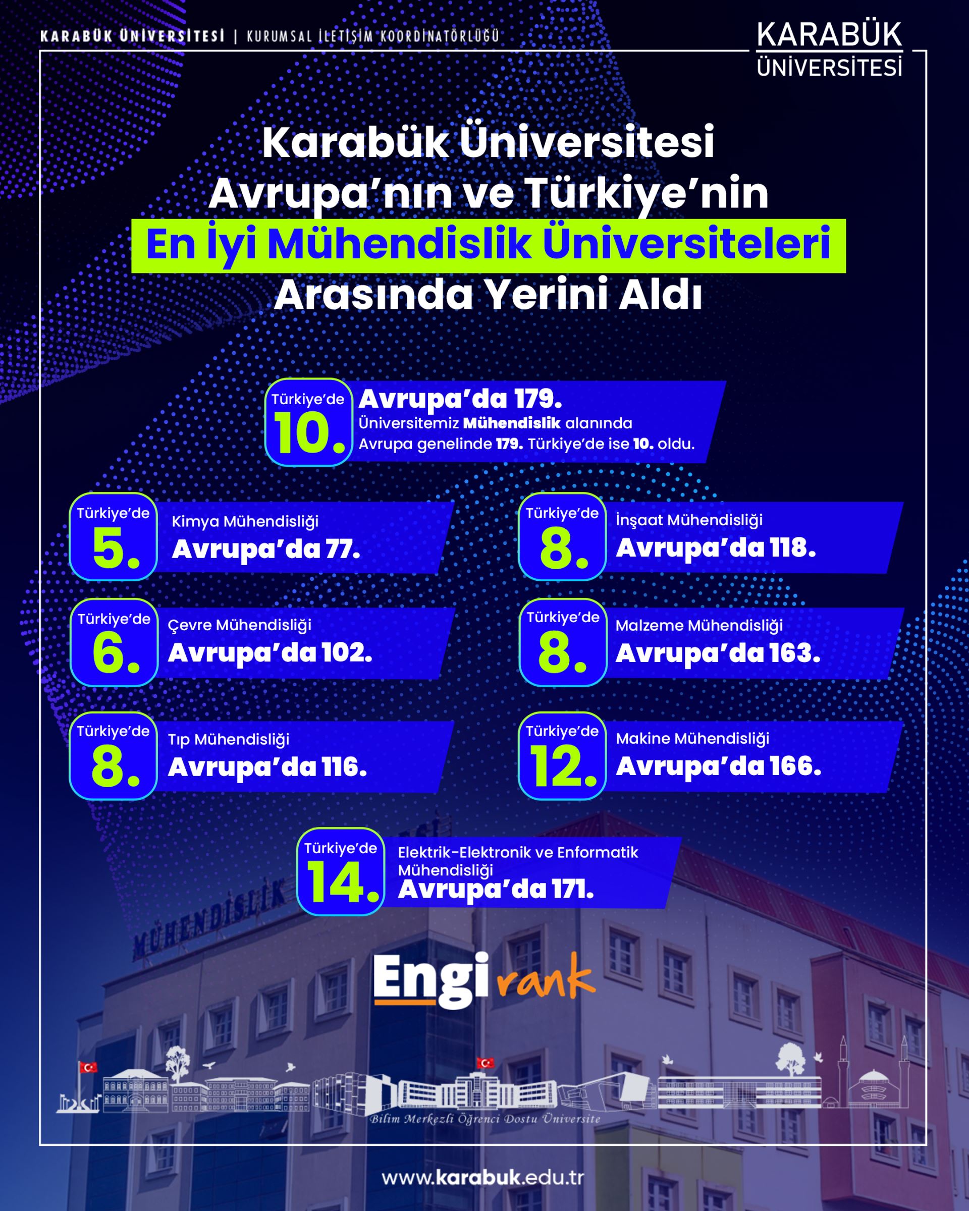 Karabük Üniversitesi, EngiRank mühendislik alan sıralamalarında şu dereceleri elde etti: