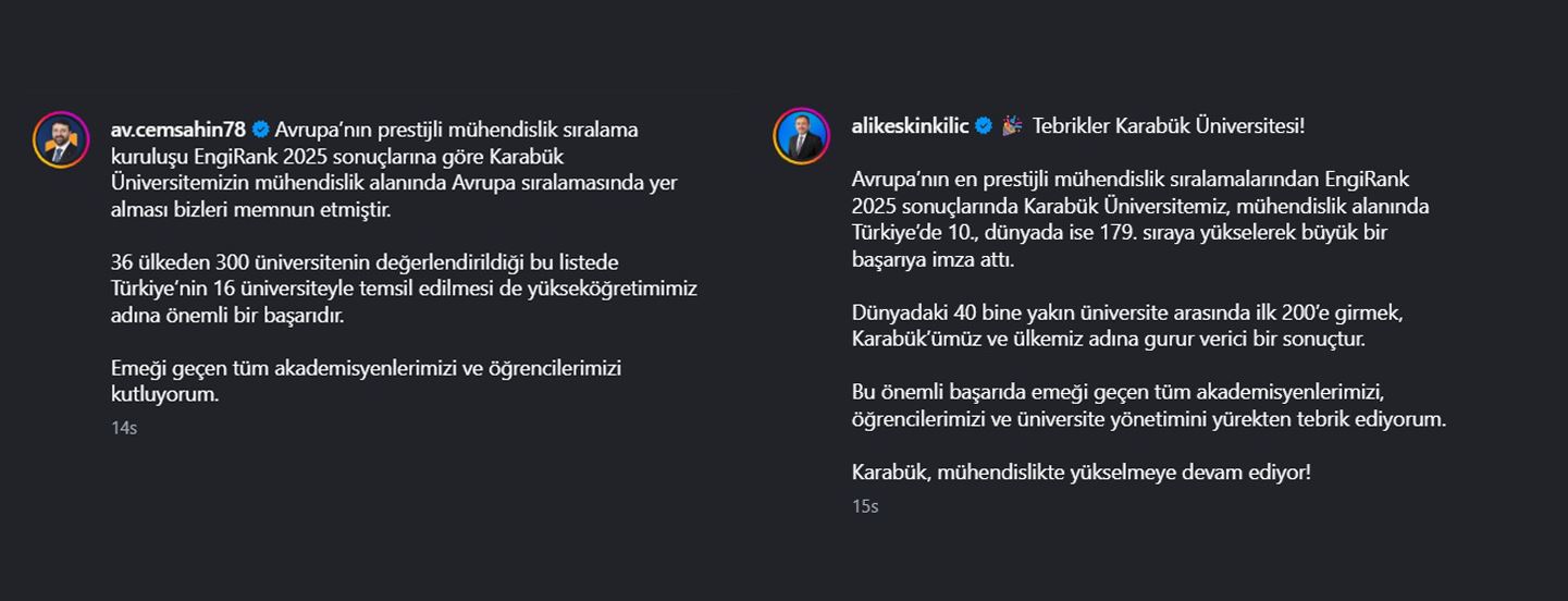 Karabük milletvekilleri Av. Cem Şahin ve Ali Keskinkılıç, sosyal medya hesaplarından yaptıkları paylaşımlarla Karabük Üniversitesini tebrik etti.