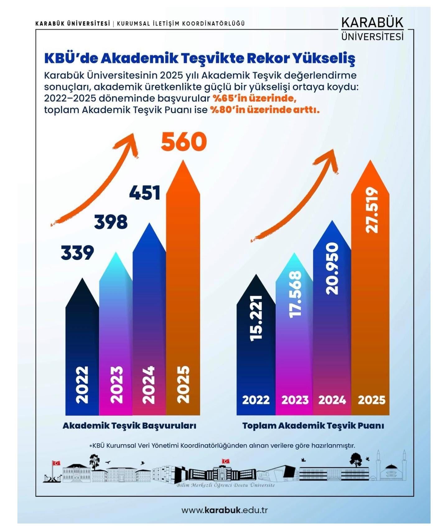 Karabük Üniversitesi, bilim merkezli öğrenci dostu üniversite vizyonu doğrultusunda akademik üretimi artırmaya, uluslararası görünürlüğünü güçlendirmeye ve toplumsal katkı odaklı projeler geliştirmeye yönelik çalışmalarını kararlılıkla sürdürüyor.