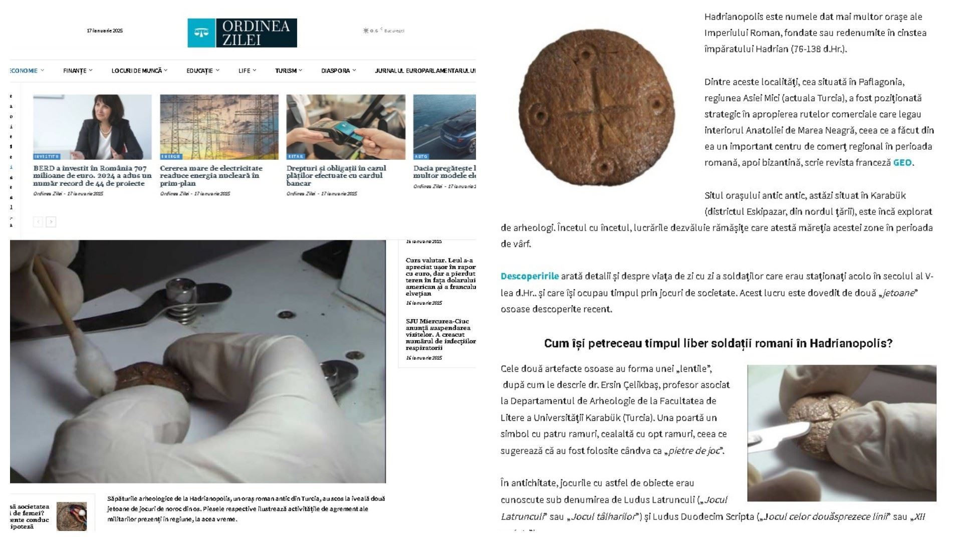 Dünya çapında ilginç coğrafi, kültürel ve bilimsel haberler ile makalelere yer veren Fransısz haber ve dergi sitesi GEO ise “Kemik oyun taşları Hadrianopolis'teki Romalı askerlerin günlük yaşamını ortaya koyuyor” başlığıyla habere yer verdi.