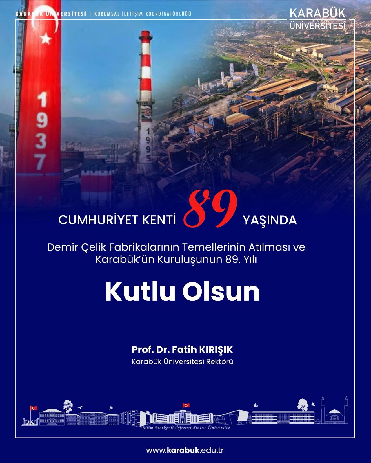 Karabük Üniversitesi Rektörü Prof. Dr. Fatih Kırışık, Karabük Demir Çelik Fabrikalarının (KARDEMİR) temellerinin atılışının ve Karabük’ün kuruluşunun 89. yıl dönümü dolayısıyla bir mesaj yayımladı.
