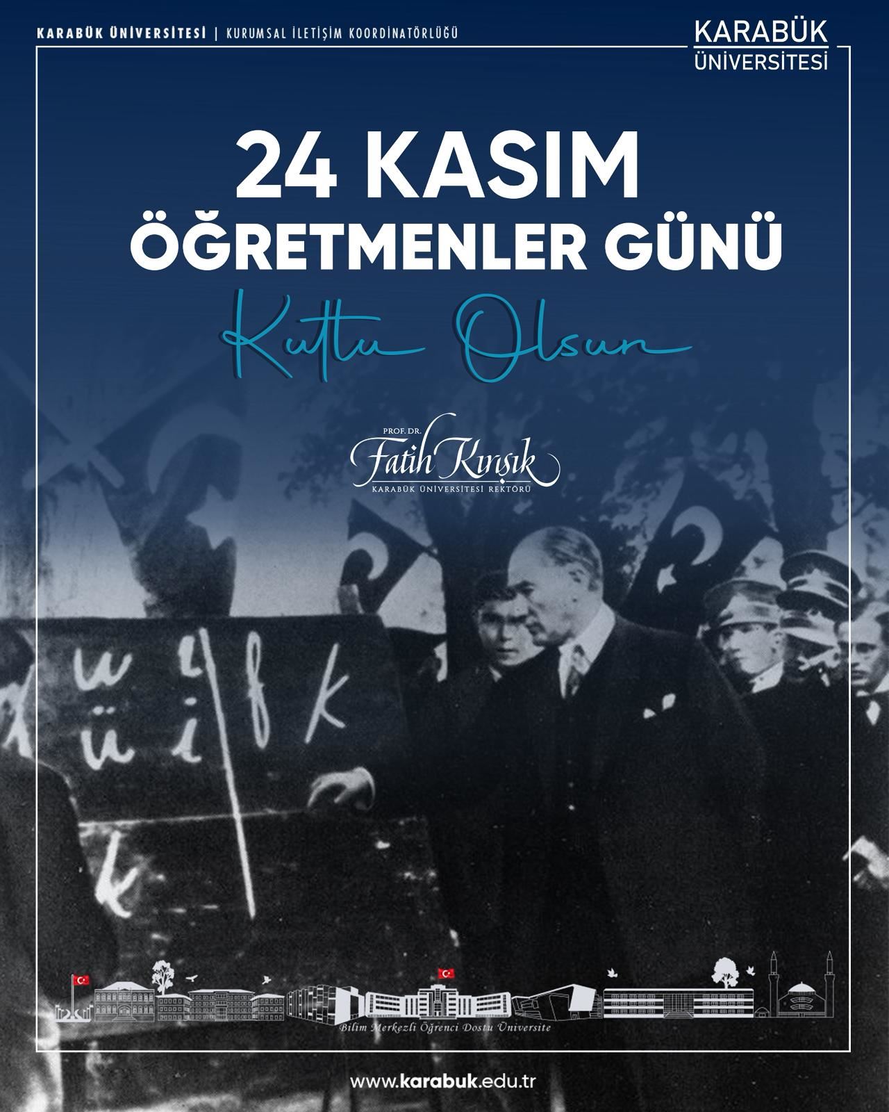 Bu özel günde, Başöğretmen Gazi Mustafa Kemal Atatürk başta olmak üzere ebediyete irtihal eden tüm öğretmenlerimizi ve vatan uğruna şehit olan öğretmenlerimizi rahmetle anıyorum. Büyük bir özveriyle görev yapan tüm akademisyenlerimizin ve öğretmenlerimizin 24 Kasım Öğretmenler Günü’nü kutluyor, sağlık, afiyet ve üstün başarılar diliyorum.”