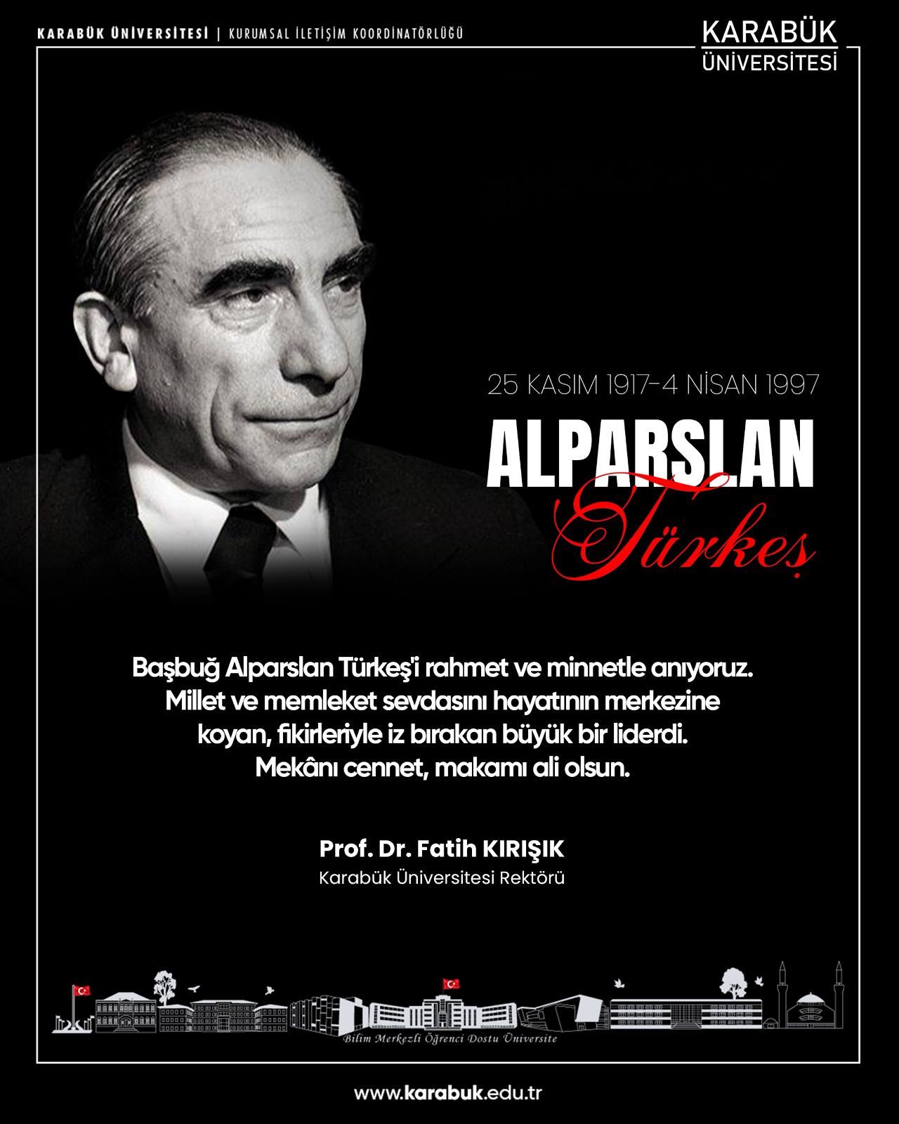 Karabük Üniversitesi (KBÜ) Rektörü Prof. Dr. Fatih Kırışık, yayımladığı anma mesajında Alparslan Türkeş’in milletine bağlılığı, kararlı duruşu ve bıraktığı kalıcı etkiye dikkat çekerek şu ifadelere yer verdi: