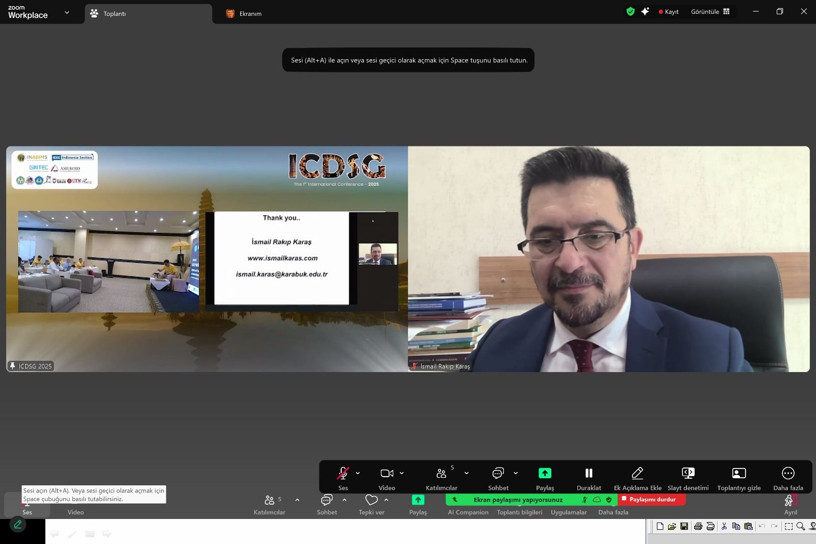 Prof. Dr. Karaş, sunumunda üç boyutlu konumsal bilişim teknolojilerinin kullanım alanlarına ve topolojik veri altyapılarının önemine değinerek, konferansın uluslararası araştırma iş birliklerini artırma açısından önemli bir platform olduğunu ifade etti.