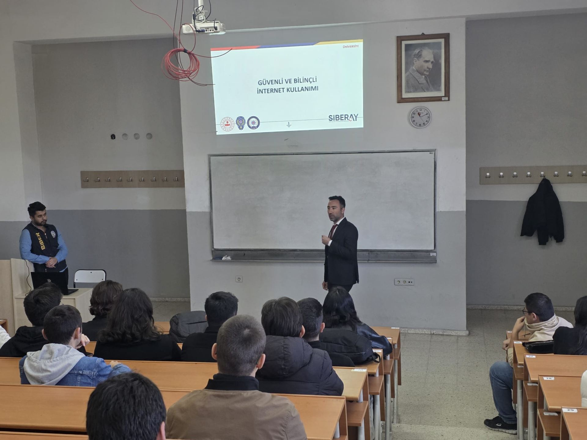 Emniyet Müdürlüğü ekipleri tarafından paylaşılan gerçek olaylardan derlenen örnekler, öğrencilerin dijital tehditlere karşı farkındalık kazanmasını sağladı. Eğitim boyunca öğrenciler merak ettikleri konular hakkında sorular yönelterek uzmanlardan doğrudan bilgi alma fırsatı buldu.