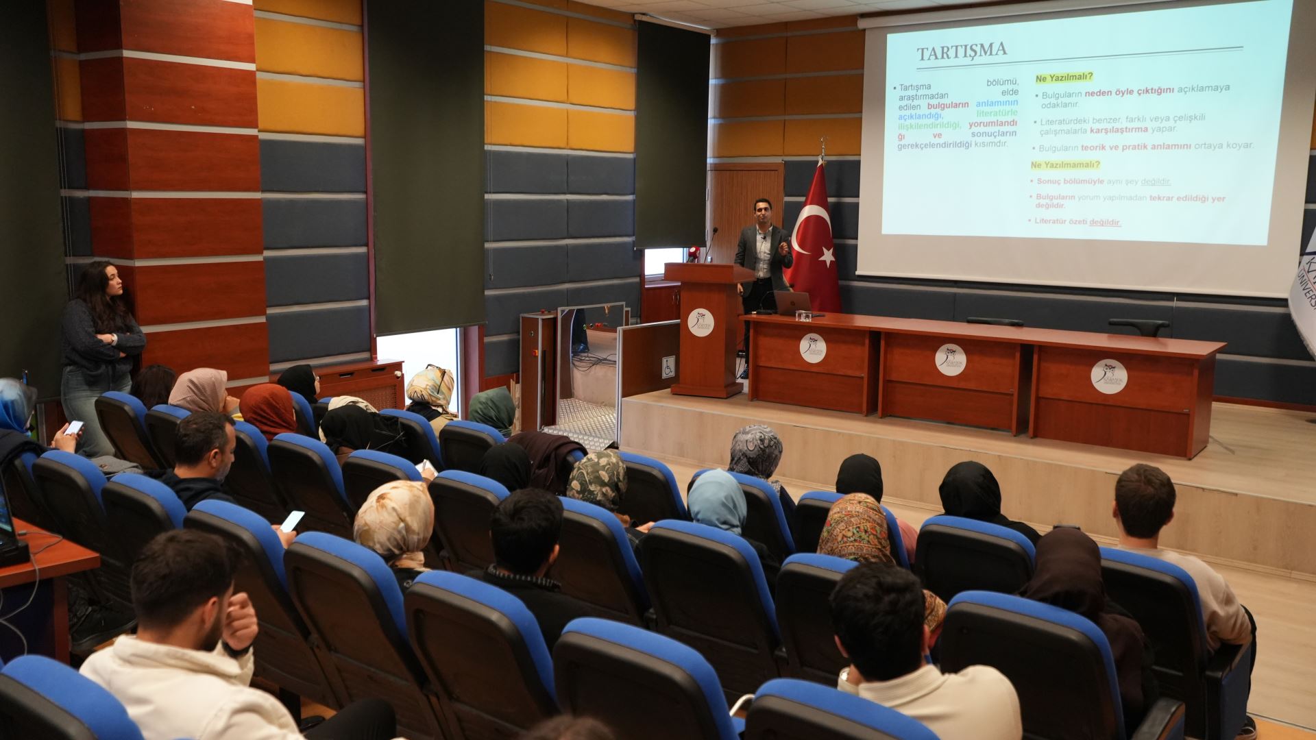 Karabük Üniversitesi Lisansüstü Eğitim Enstitüsü tarafından düzenlenen “Tez Yazımı” eğitim seminerinde Doç. Dr. Mahmut Polatcan, tezlerde tartışma, sonuç ve öneriler bölümlerinin doğru yapılandırılmasına ilişkin akademik ipuçları paylaştı.