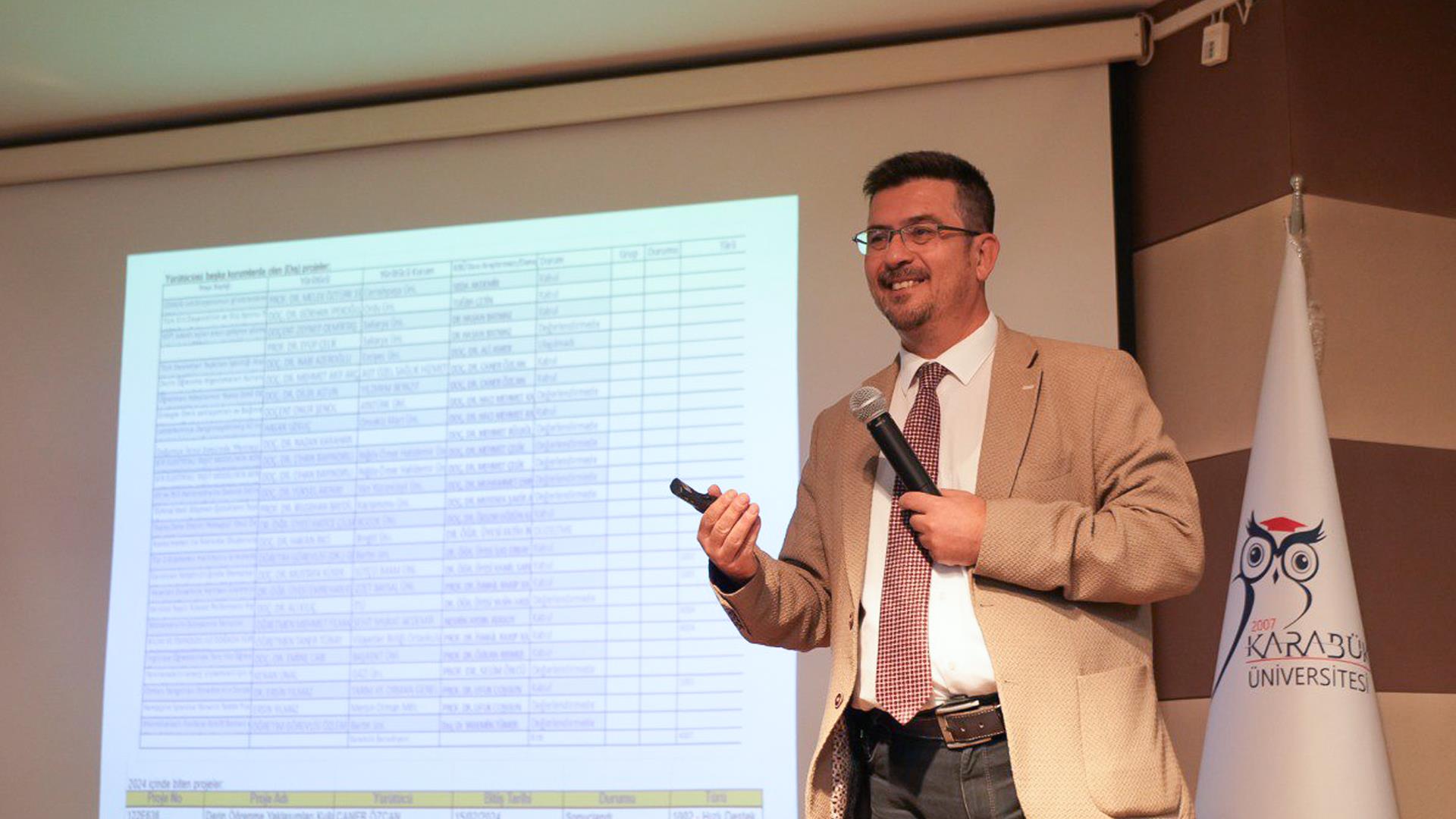 Karabük Üniversitesinde düzenlenen seminerde Prof. Dr. İsmail Rakıp Karaş ve Prof. Dr. Nizamettin Kahraman, akademisyenlere proje yazımı ve yürütülmesine ilişkin deneyimlerini aktardı.