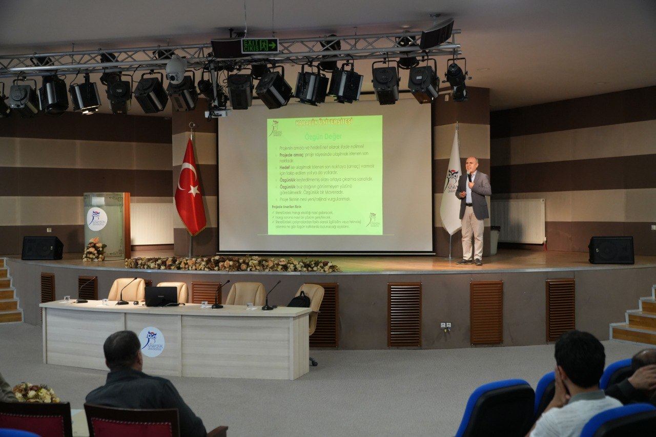 Karabük Üniversitesinde düzenlenen seminerde Prof. Dr. Nizamettin Kahraman, akademisyenlere proje yazımı ve yürütülmesine ilişkin deneyimlerini aktardı.