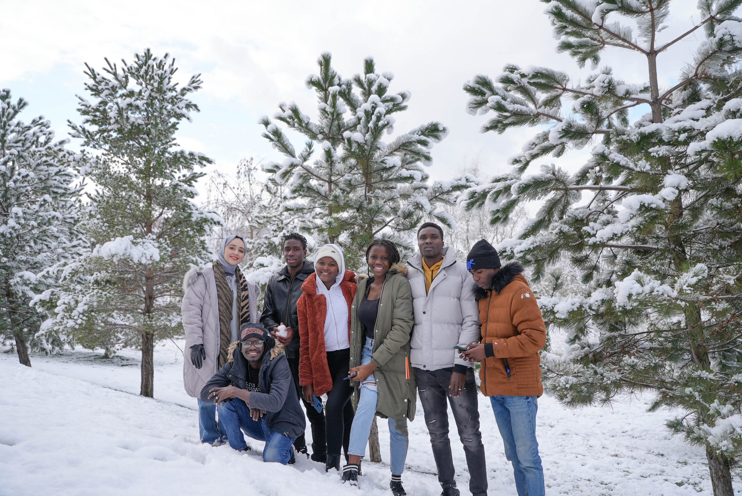 Karabük Üniversitesine, Afrika ülkelerinden eğitim için gelen öğrenciler, hayatlarında ilk kez gördükleri karın keyfini doyasıya çıkardı.