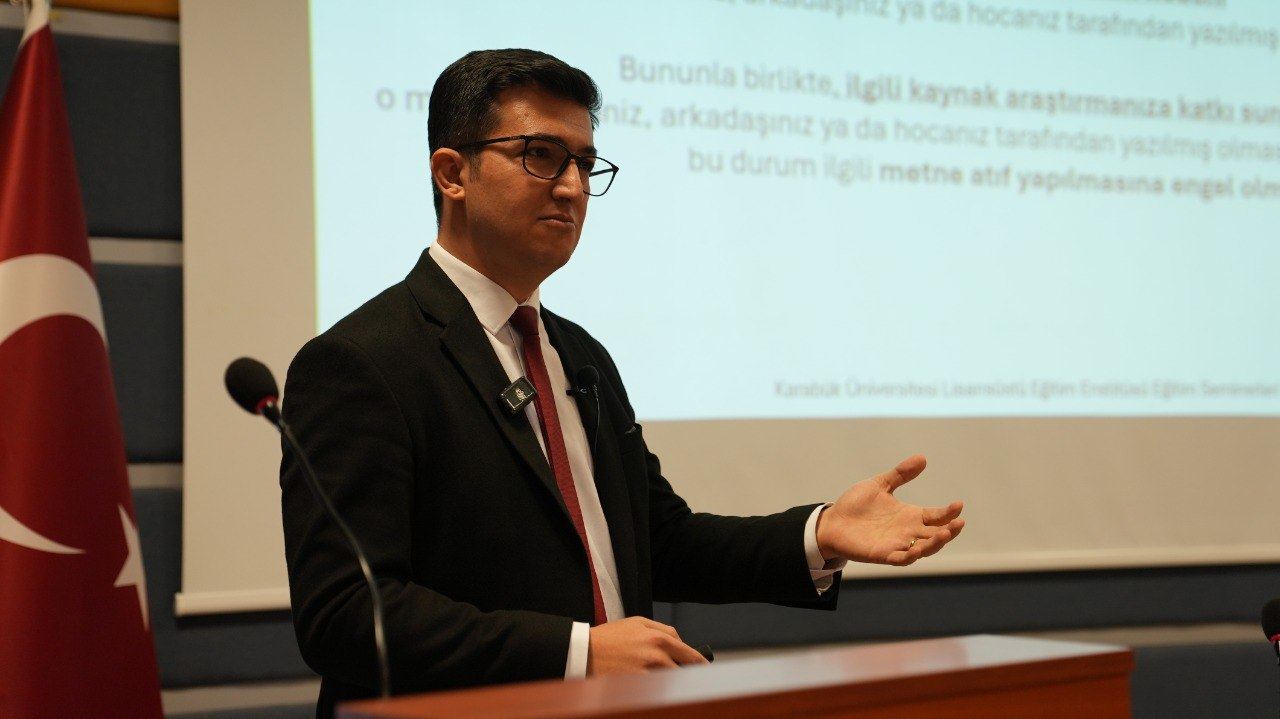 Karabük Üniversitesi (KBÜ), lisansüstü öğrencilerin akademik yazım becerilerini güçlendirmek amacıyla yürüttüğü 6 haftalık Tez Yazım Atölyesi programını “Tez Yazımında Atıf Yapma, Kaynakça Düzenleme ve Tez Yazım Kılavuzu Kullanma” başlıklı seminerle sürdürdü.