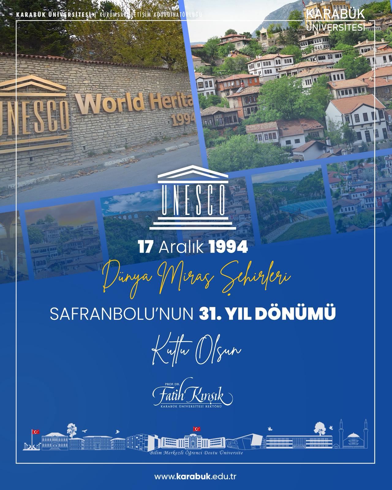Karabük Üniversitesi (KBÜ) Rektörü Prof. Dr. Fatih Kırışık, Safranbolu’nun 17 Aralık 1994’te UNESCO Dünya Mirası Listesi’ne kabul edilişinin 31. yıl dönümü dolayısıyla bir mesaj yayımladı.