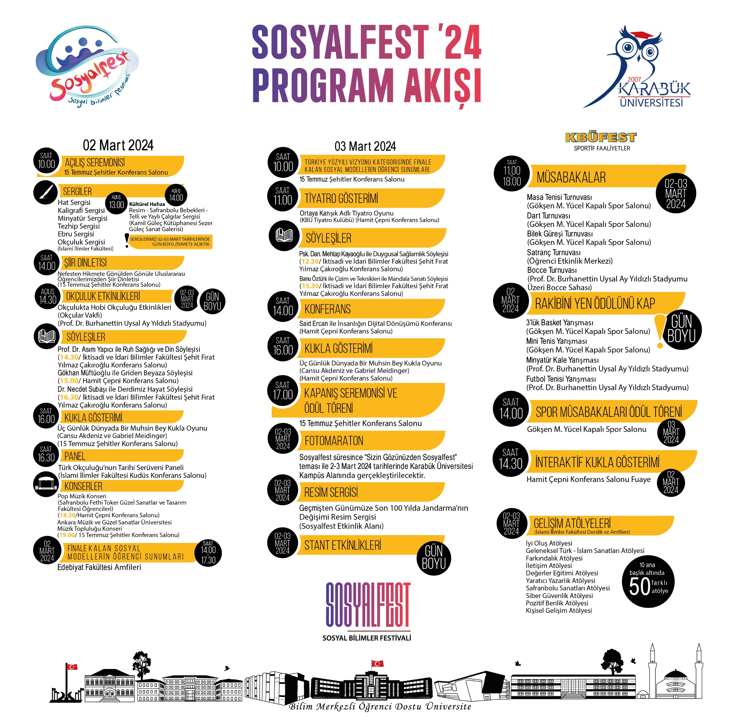 Karabük Üniversitesi ev sahipliğinde 2-3 Mart’ta düzenlenecek Türkiye’nin ilk ulusal ve uluslararası Sosyal Bilimler Festivali Sosyalfest’in programı belli oldu.